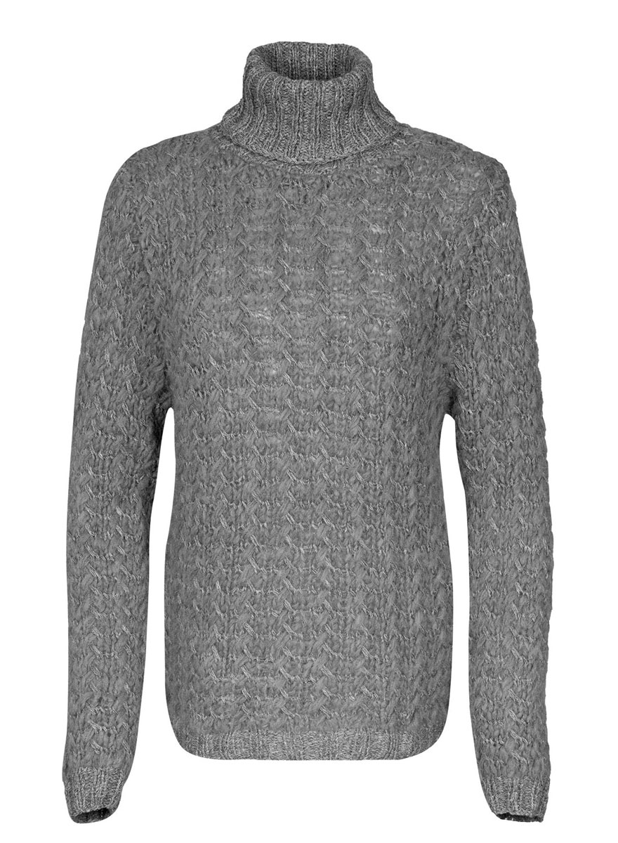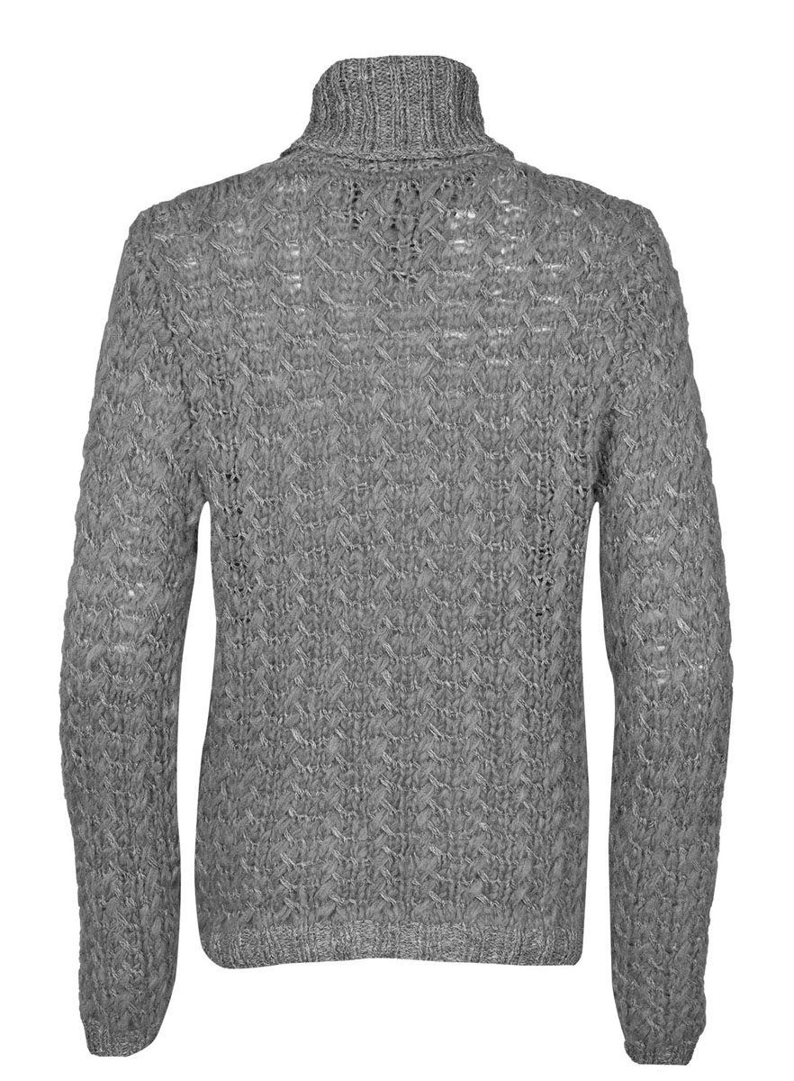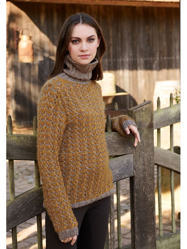 150 (200, 250) g of Lana Grossa Smokey (46% Merino wool, 41% cotton, 8% polyamide, 5% yak; 225 m/50 g) in Greige/Red-Brown/Light Grey (col 205) and 200 (250, 300) g of Lana Grossa Peloso (54% Merino wool, 26% mohair, 20% acrylic; 210 m/50 g) in Gold Brown (col 7). Size 6 and 7 mm needles; size 6 and 7 mm circular needles, each 40 cm long
