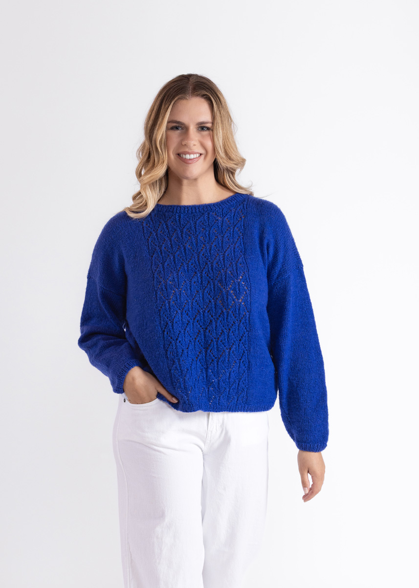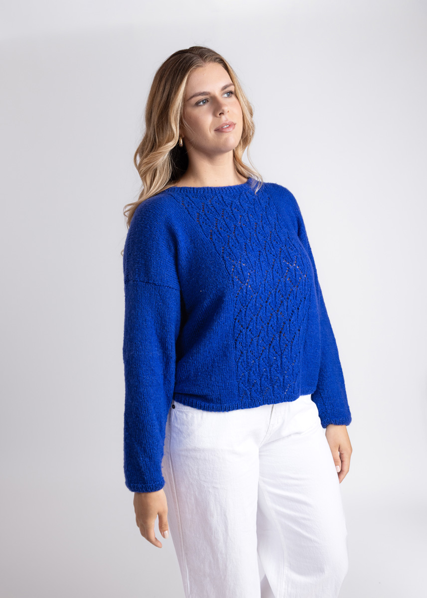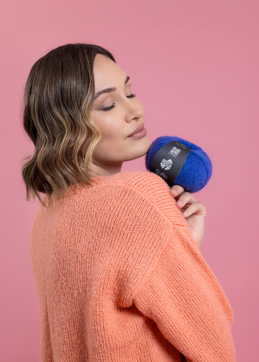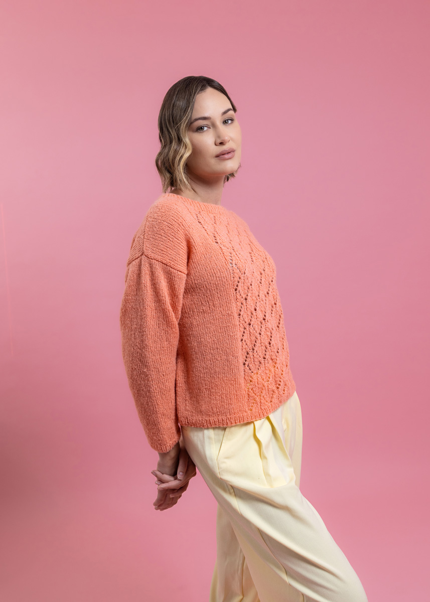 The pullover is knitted throughout with 2 strands of yarn held together. It has a total length of 53 (55 - 57 - 59 - 61 - 63) cm and a positive ease of 22 cm at 80 cm bust circumference (18 cm at 88 cm bust circumference - 14 cm at 96 cm bust circumference - 14 cm at 104 cm bust circumference - 10 cm at 116 cm bust circumference - 10 cm at 128 cm bust circumference).