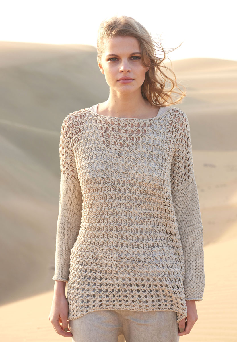 500 (550, 600) g of Lana Grossa Solo Lino Mélange (80% recycled linen (viscose), 20% linen; 105 m/50 g) in Beige Mélange (col 103). Size 5 mm needles; size 5 mm crochet hook
