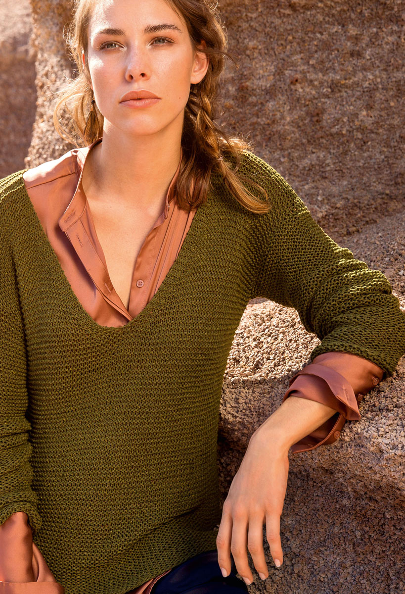 500 (550, 600) g of Lana Grossa Solo Lino Mélange (80% recycled linen (viscose), 20% linen; 105 m/50 g) in Dark Khaki Melange (col 115). Size 5.5 mm needles