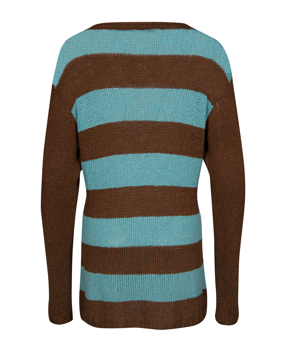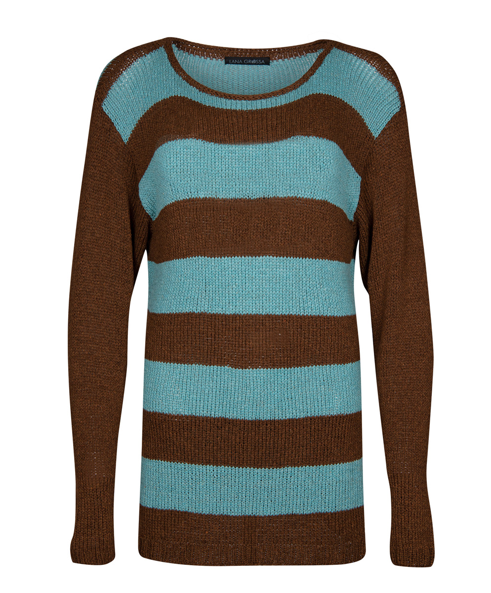 450 (500) g of Lana Grossa Solo Lino Mélange (80% recycled linen [viscose], 20% linen; 105 m/50 g) in Dark Brown Mélange (col 117) and 200 g in Mint Mélange (col 119). Size 4 and 5 mm needles; size 4 mm circular needle, 50 cm long