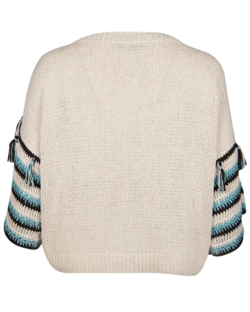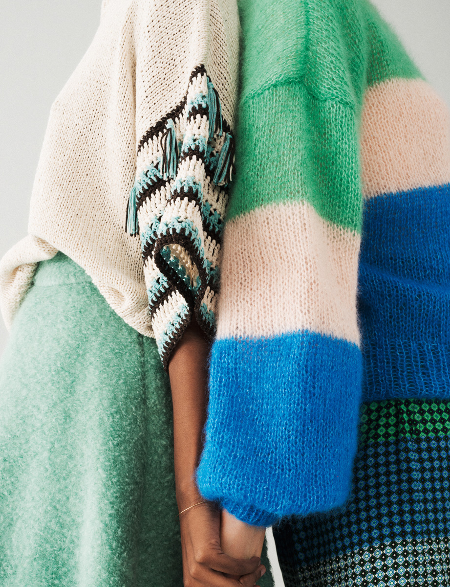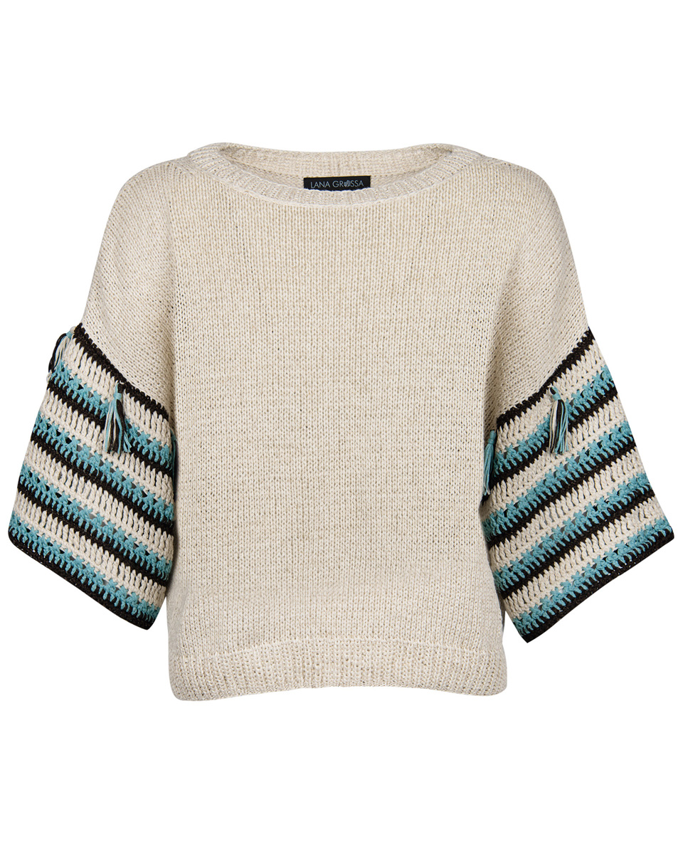 500 (550, 600) g of Lana Grossa Solo Lino Mélange (80% recycled linen [viscose], 20% linen; 105 m/50 g) in Natural Mélange (col 101) and 50 g each in Mocha Mélange (col 121) and Mint Mélange (col 119). Size 3 and 5 mm needles; size 3 mm circular needle, 40 cm long; size 4 mm crochet hook