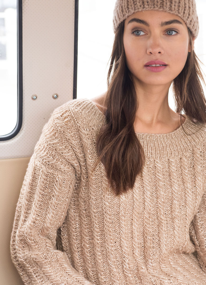300 (350, 400) g of Lana Grossa Stellina (40% Merino wool, 35% viscose, 25% polyamide; 160 m/50 g) in Beige/Camel (col 16). Size 4.5 and 5 mm needles; size 4.5 mm circular needle, 60 cm long; cable needle [cn].