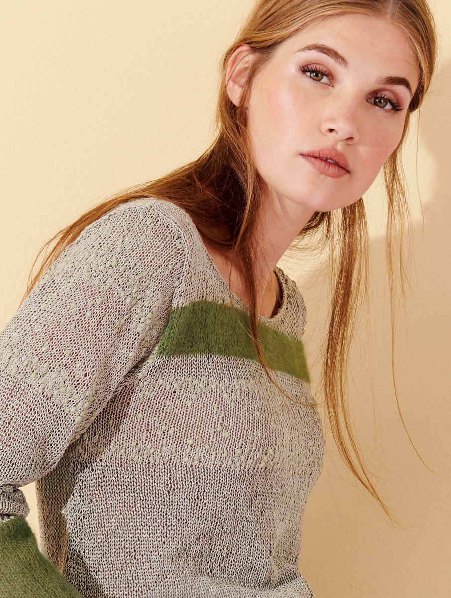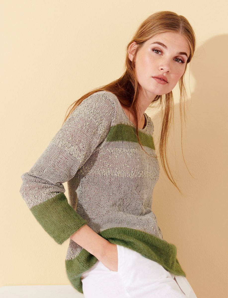 200 (250, 300, 350) g of Lana Grossa Stromboli (60% cotton, 15% viscose, 15% polyamide; 10% silk; 150 m/50 g) in Green/Beige (col 106), 150 (200, 250, 300) g of Lana Grossa Capri (55% cotton, 30% polyamide, 15% silk; 150 m/50 g) in Stone Grey (col 11) and 50 (75, 100, 125) g of Silkhair (70% mohair, 30% silk; 210 m/25 g) in Moss Green (col 127). Size 4 mm needles; size 4 mm circular needle, 40 cm long