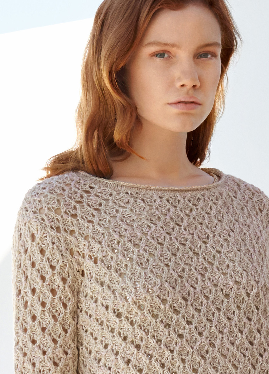 350 (400, 450) g of Lana Grossa Stromboli (60% cotton, 15% viscose, 15% polyamide, 10% silk; 150 m/50 g in Ecru (col 101) and 200 (250, 300) g of Lana Grossa Ecopuno (72% cotton, 17% pure wool, 11% alpaca; 215 m/50 g) in Greige (col 18). Size 3.5 and 4.5 mm needles; size 3.5 mm circular needle, 50 cm long