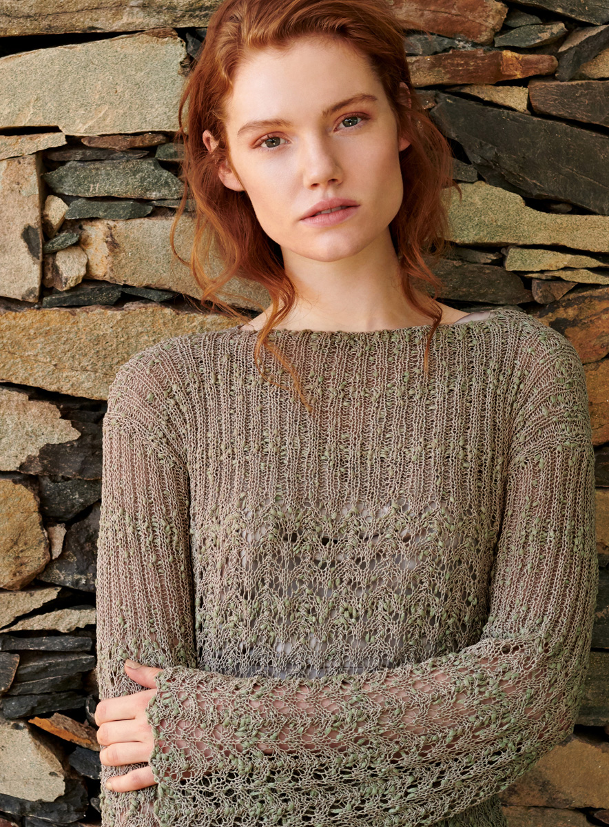 450 (500) g of Lana Grossa Stromboli (60% cotton, 15% viscose, 15% polyamide, 10% silk; 150 m/50 g in Green/Beige (col 106). Size 4.5 mm needles; size 3.5 mm crochet hook