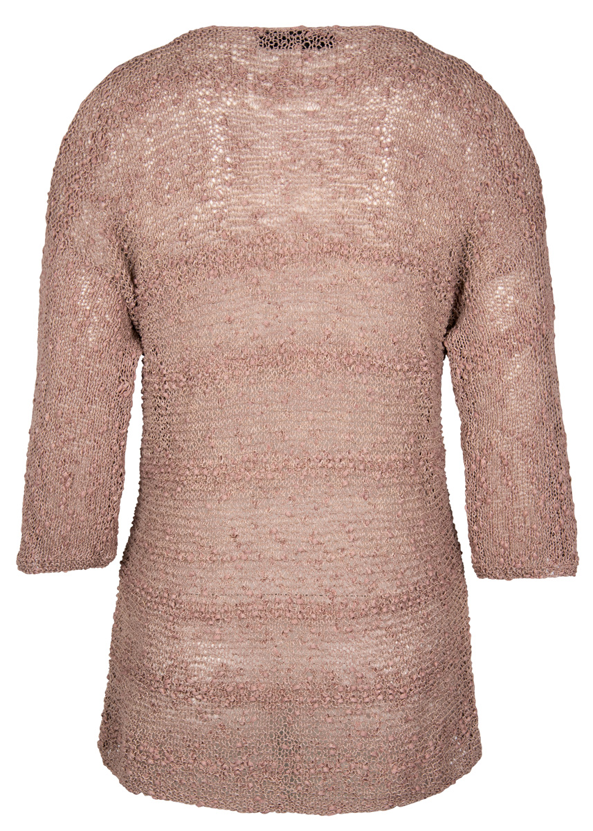 350 (400, 450) g of Lana Grossa Stromboli (60% cotton, 15% viscose, 15% polyamide, 10% silk; 150 m/50 g in Beige (col 113). Size 3.5 and 4.5 mm needles; size 4.5 mm circular needle, 60 cm long; size 4 mm crochet hook
