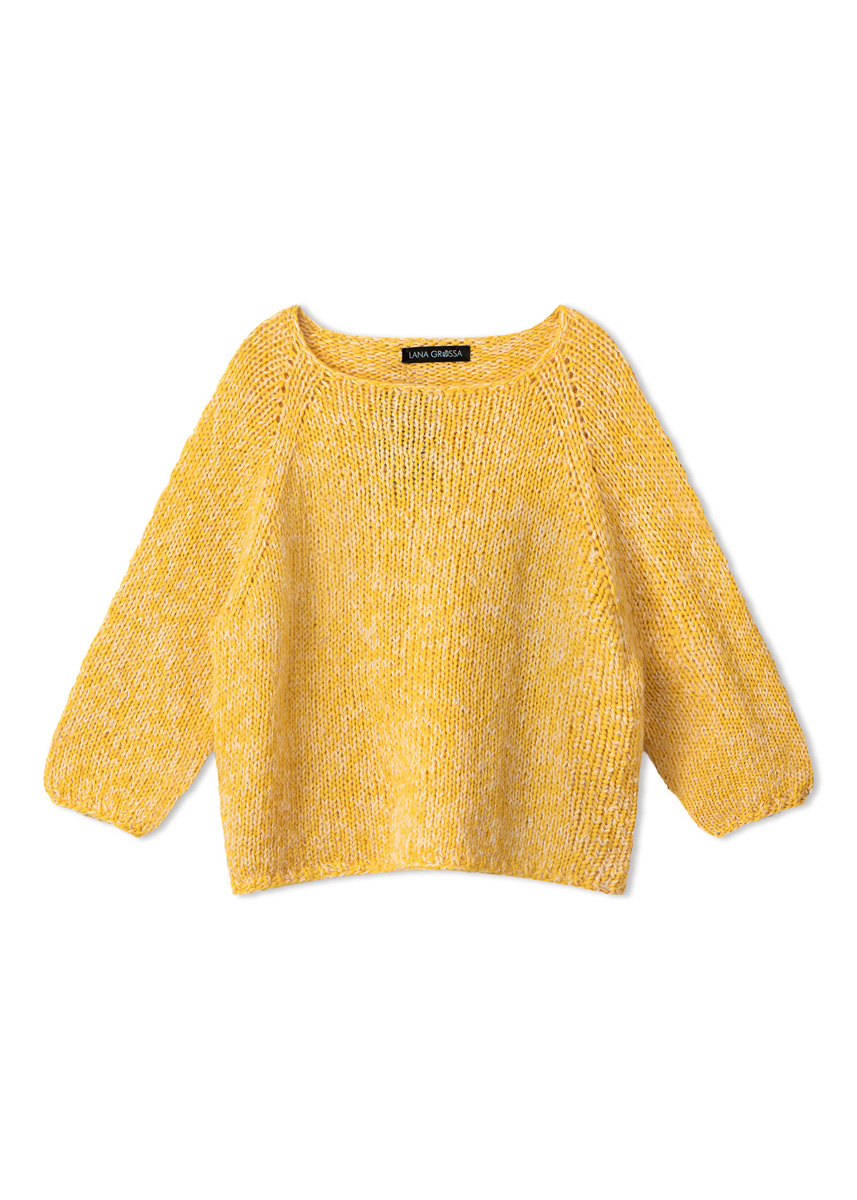 250 (300, 350, 400) g of Lana Grossa Summer Softness (80% organic cotton, 20% superfine Merino wool; 130 m/50 g) in Yolk (col 21); 75 (100, 100, 125) g of Lana Grossa Setasuri Pearls (50% Suri alpaca, 22% silk, 16% cotton, 12% glass; 140 m/25 g) in Light Beige (col 201). Short and long size 7 mm circular needles; one set size 7 mm double-pointed needles [dpns]; stitch markers; stitch holders.