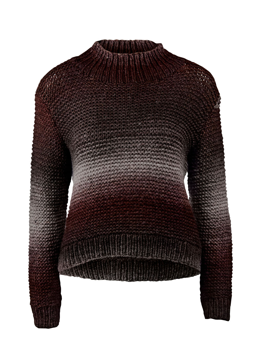 400 (500, 500) g of Lana Grossa Super Color (64% pure wool, 30% alpaca, 6% polyamide; 240 m/100g) in Natural/Grey-Brown/Grey-Red/Blackberry (col 108). Size 6 and 8 mm needles; size 6 mm circular needle, 40 cm long