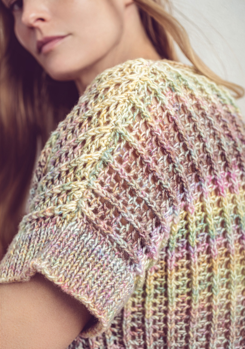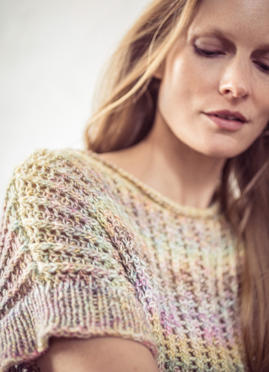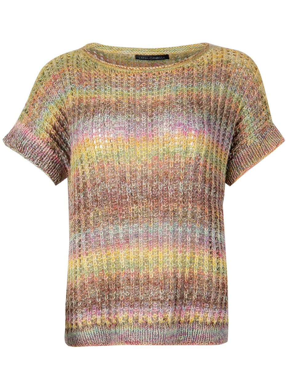 350 (400, 450) g of Lana Grossa Tropico (70% cotton, 30% Merino wool; 125 m/50 g) in Pistachio/Light Green/Terracotta/Cyclamen/Purple/Pink/Yellow (col 1). Size 4.5 and 5 mm needles; size 4.5 mm circular needle, 40 cm long