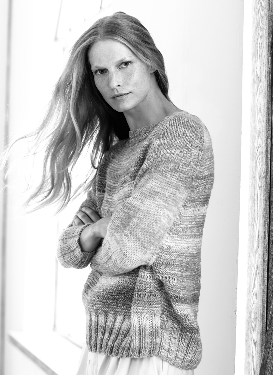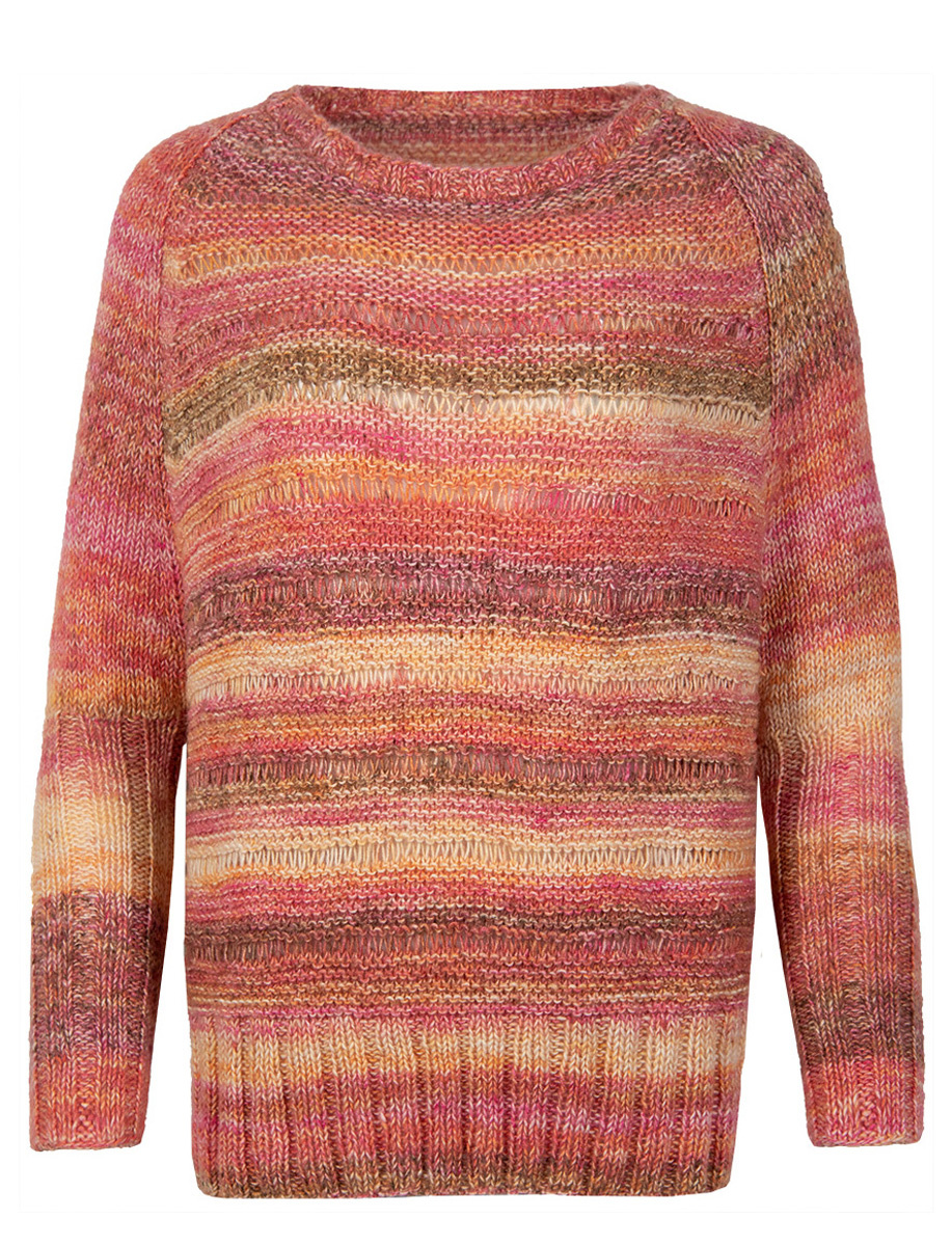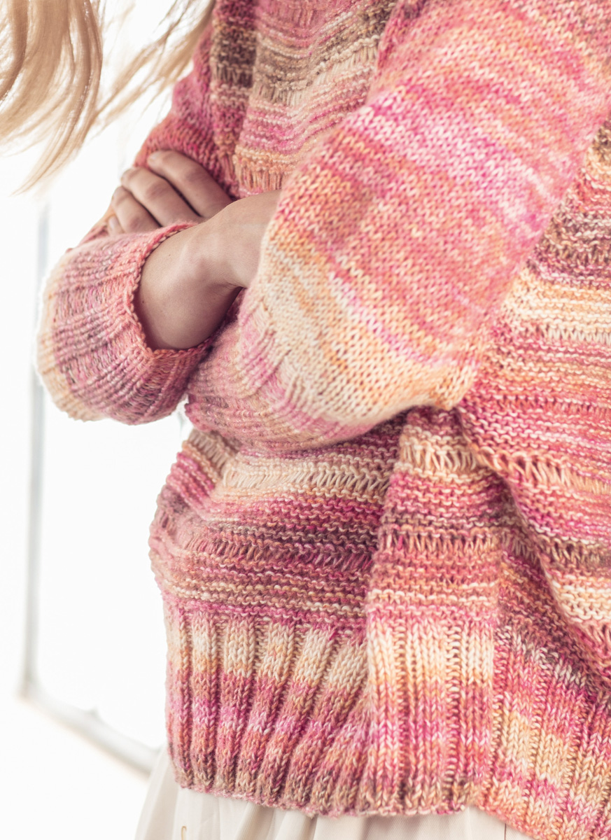 400 (450, 500) g of Lana Grossa Tropico (70% cotton, 30% Merino wool; 125 m/50 g) in Pink/Mandarine/ White/Salmon (col 2). Size 4.5 and 5 mm needles; size 4.5 mm circular needle, 40 cm long; size 4 mm crochet hook