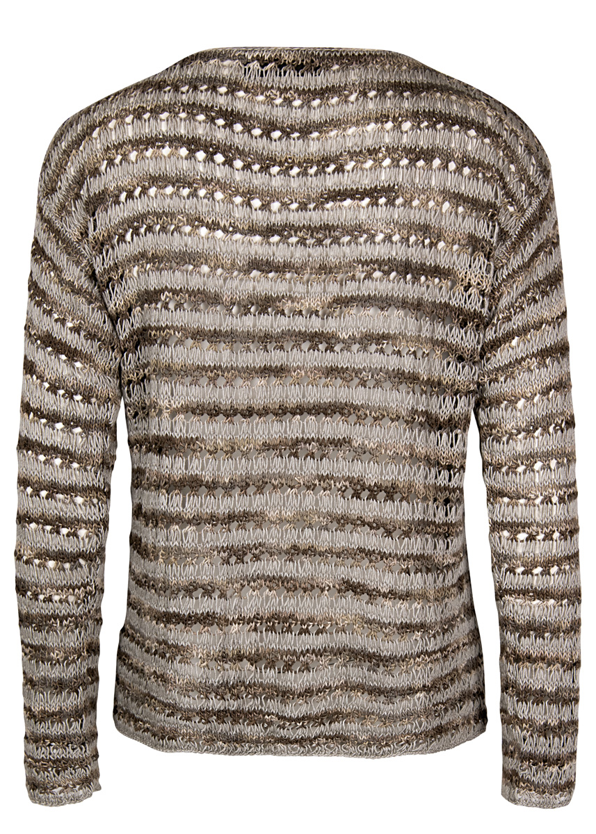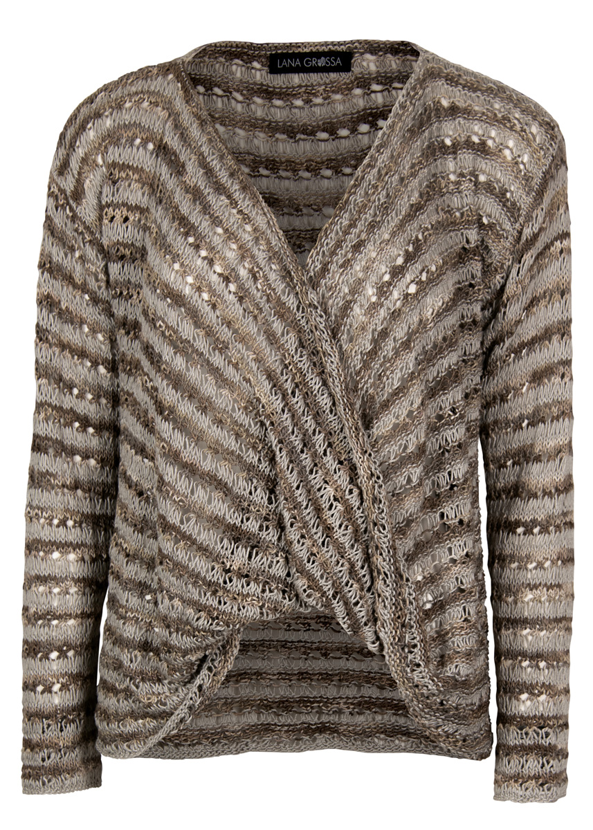 300 (400) g of Lana Grossa Unico (70% bamboo, 30% linen; 250 m/100 g) in Mocha/Taupe/Greige (col 5) and 200 (250) g of Lana Grossa Solo Lino (80% recycled linen [viscose], 20% linen; 120 m/50 g) in Green/Grey (col 5). Size 3.5 mm needles; size 3.5 mm crochet hook