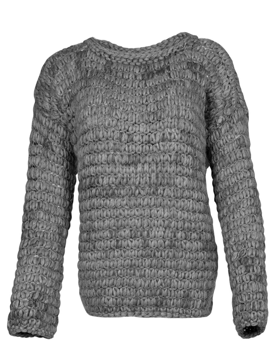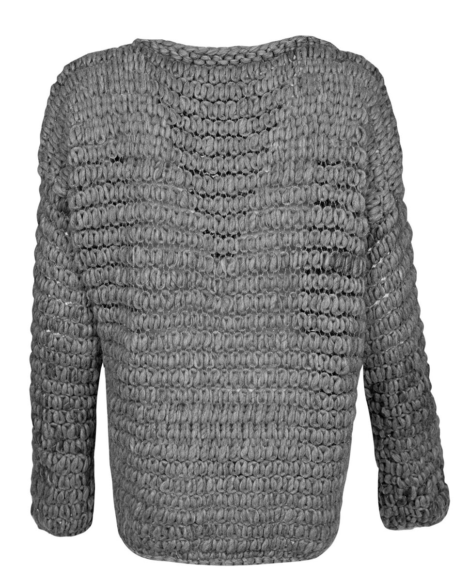 600 g of Lana Grossa Weekend Color (69% extrafine Merino wool, 30% baby alpaca, 1% cotton; 35 m/100 g) in Grey/Raspberry/Light Blue (col 102) and 25 g of Lana Grossa Silkhair Lusso (78% superkid mohair, 14% silk, 4% polyester, 4% polyamide; 210 m/25 g) in Copper (col 922). Size 12 mm circular needle, 80 cm long; size 9 mm circular needle, 50 cm long