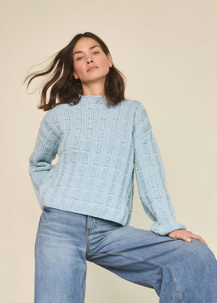 550 (600, 650, 700) g of Lana Grossa Winter Softness (62% extrafine Merino wool, 38% organic cotton; 70 m/50 g) in Mint Blue (col 2). Size 6 and 7 mm needles; short size 6 mm circular needle.