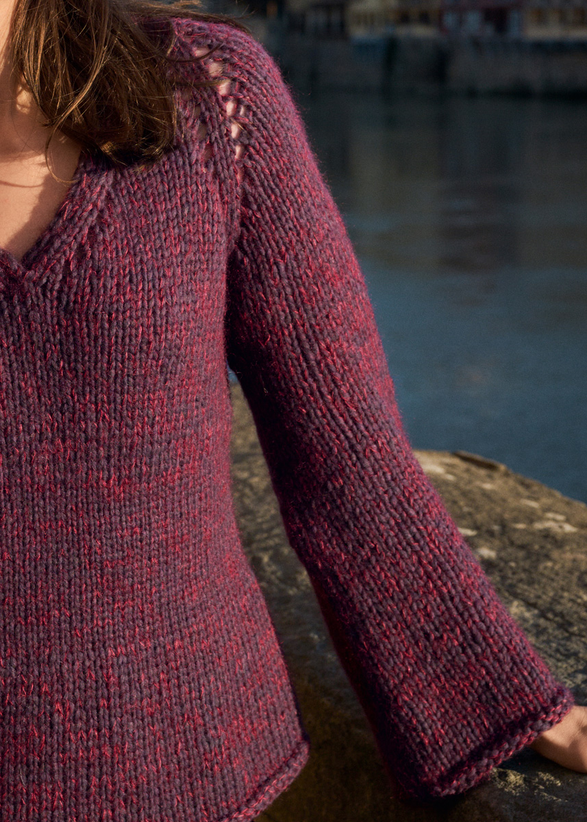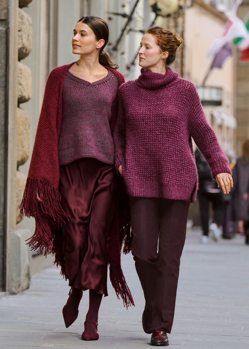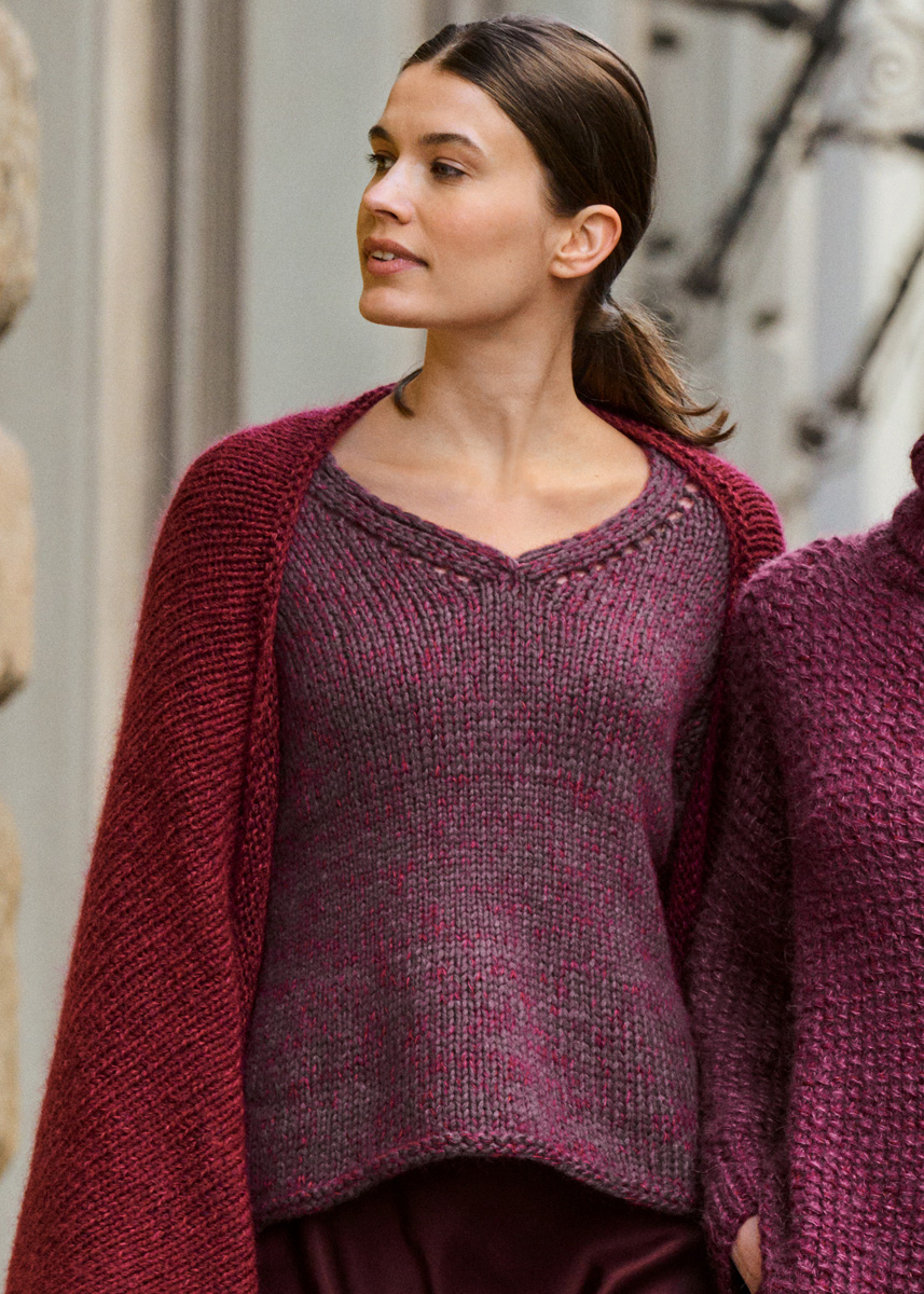 400 (450, 500, 550) g of Lana Grossa Winter Softness (62% extrafine Merino wool, 38% organic cotton; 70 m/50 g) in Aubergine (col 9); 75 (75, 100, 100) g of Lana Grossa Silkhair (70% superkid mohair, 30% silk; 210 m/25 g) in Bordeaux (col 113). Short and long size 4, 6 and 8 mm circular needles.