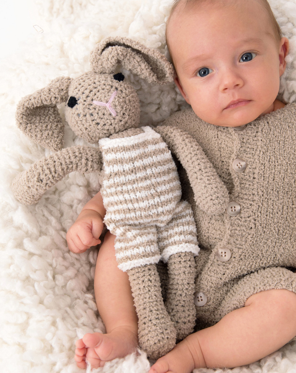 50 g each of Lana Grossa Baby Soft (60% polyamide, 40% cotton; 150 m/50 g) in Beige (col 21 and Ecru (col 2) and 50 g each of Lana Grossa Cool Wool Baby (100% pure wool; 220 m/50 g) in Pink (col 216) and Charcoal (col 205). Size 3.5 mm needles; one set size 3.5 mm double-pointed needles [dpns]; size 3 mm crochet hook; tapestry needle; fiber fill