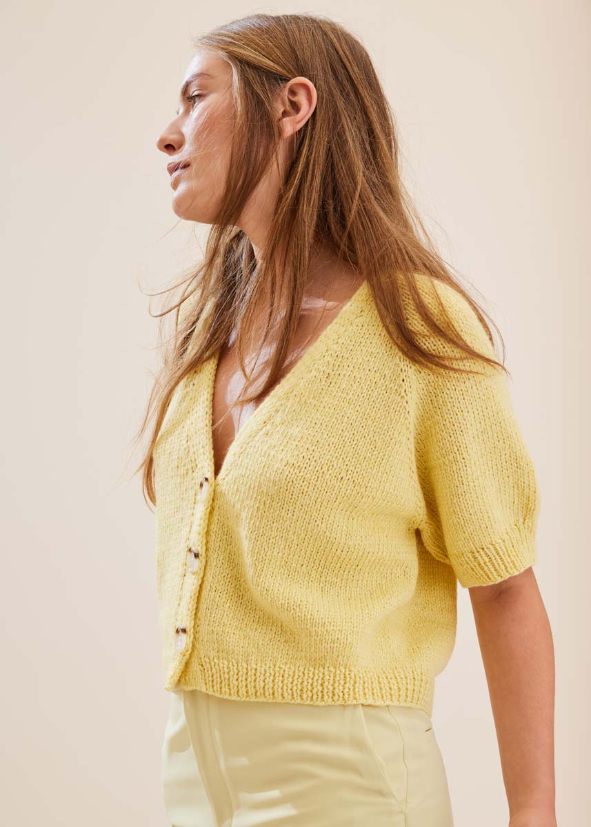 300 (350, 350, 400) g of Lana Grossa Summer Softness (80% organic cotton, 20% superfine Merino wool; 130 m/50 g) in Yellow (col 11). Size 4 and 6 mm needles; three 28 mm buttons in beige [by Union Knopf, item 454230].