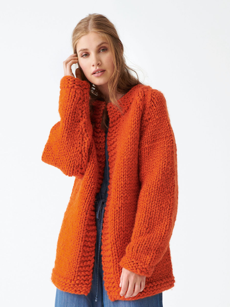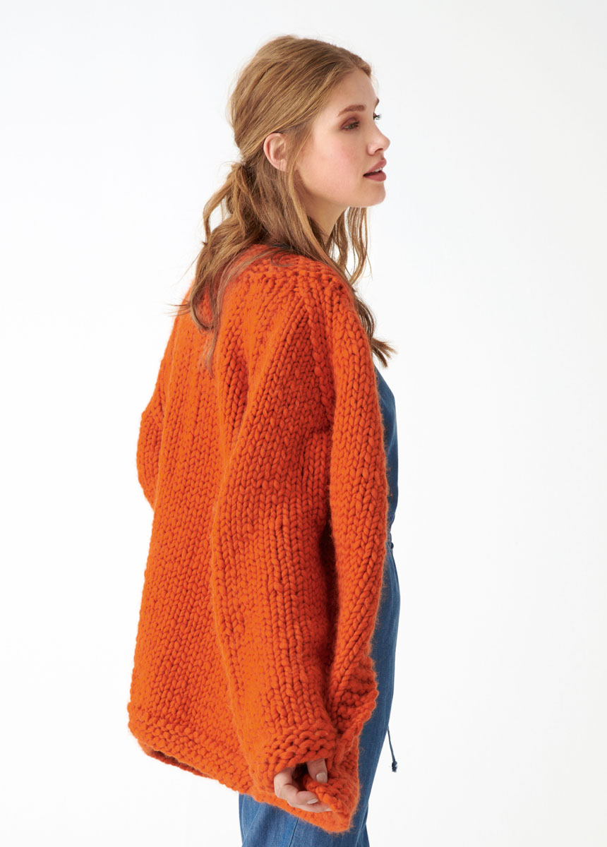 1200 (1300) g of Lana Grossa Weekend (69% extrafine Merino wool, 30% baby alpaca, 1% cotton; 35 m/100 g) in Orange (col 6). Size 15 and 20 mm needles; size 15 mm circular needle, 80 cm long