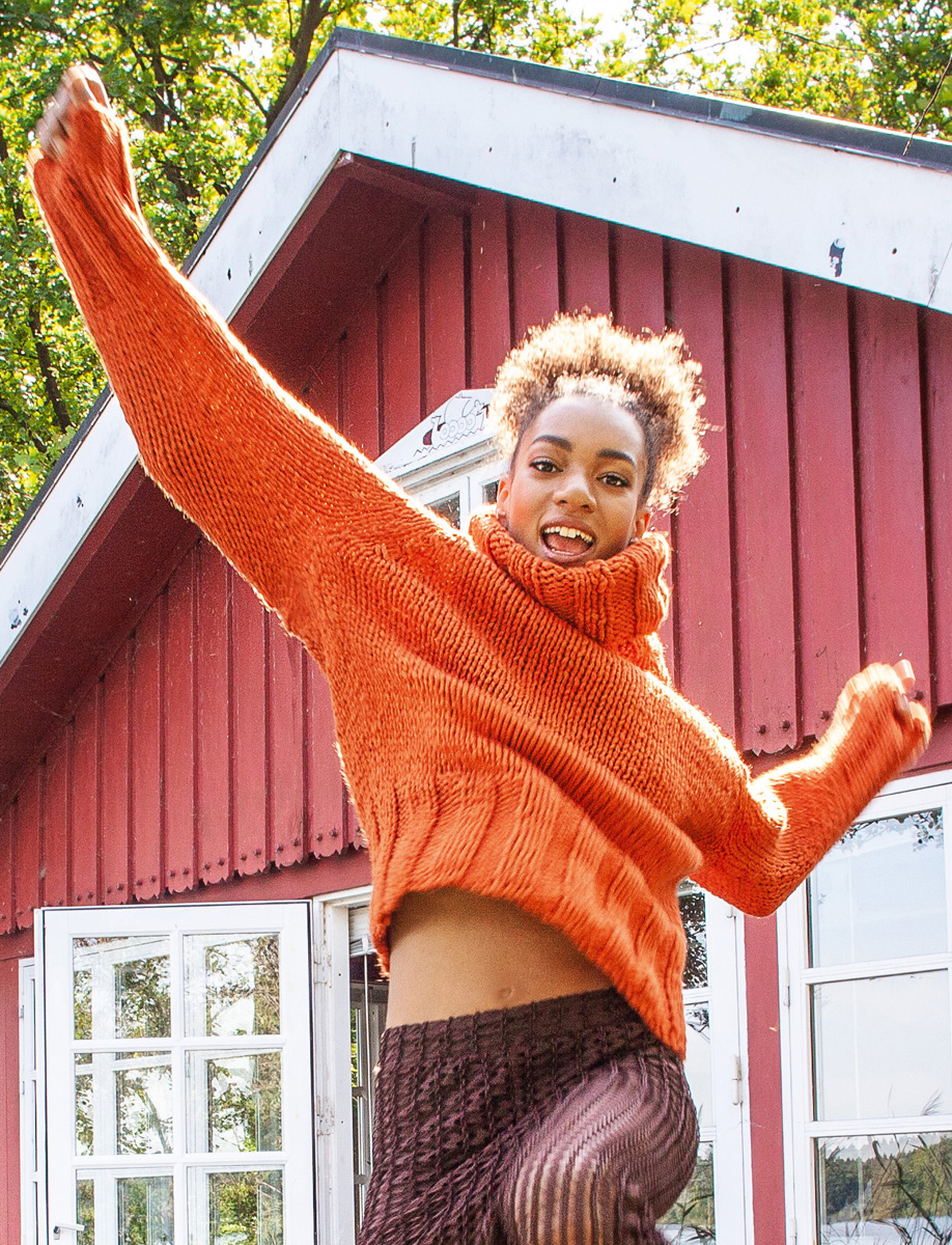 800 (850) g of Lana Grossa Alta Moda Superbaby (67% Merino wool, 30% baby alpaca, 3% polyamide; 60 m/50 g) in Signal Orange (col 50). Size 9 and 10 mm needles; size 9 and 10 mm circular needles, each 50 cm long