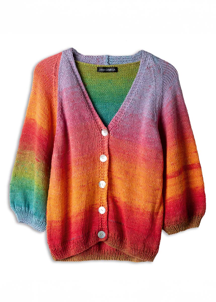 400 (400, 500, 500) g of Lana Grossa Cotonella (100% Pima cotton; 280 m/100 g) in Lilac/Light Blue/Turquoise Green/Mustard/Tomato/Raspberry/Orange/Salmon (col 11). Size 4 and 5 mm needles; five 25 mm mother-ofpearl buttons [by Union Knopf, item 37604, col 12].