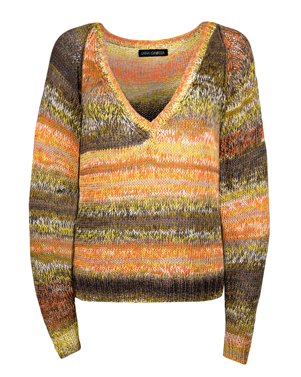 450 (500) g of Lana Grossa A Mano (100% organic cotton; 110 m/50 g) in Natural/Beige/Dark Brown/Orange/ Yellow (col 9). Size 6 and 7 mm needles; size 6 mm circular needle, 60 cm long