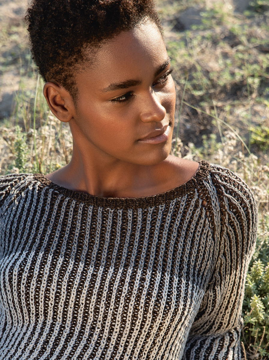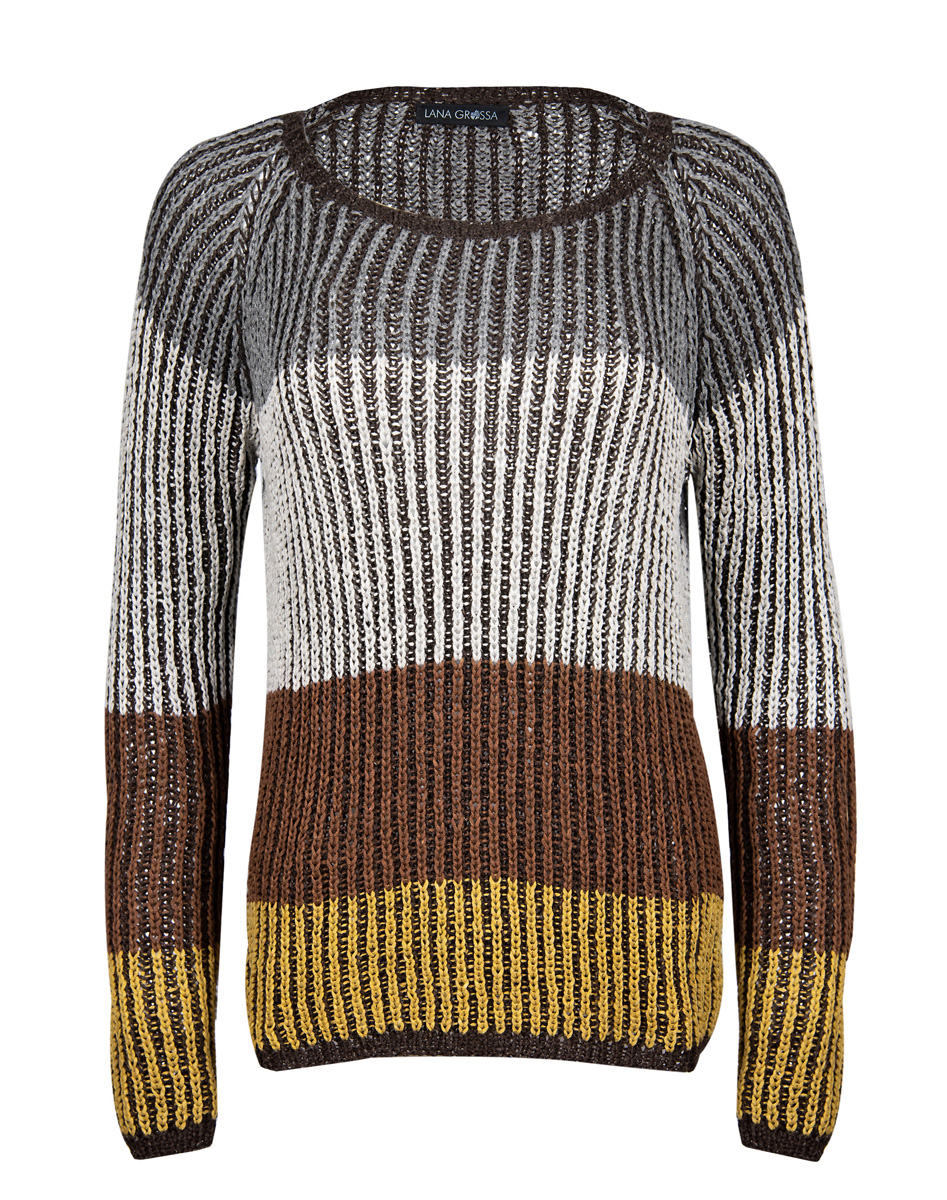 250 g of Lana Grossa Solo Lino Mélange (80% recycled linen [viscose], 20% linen; 105 m/50 g) in Mocha Mélange (col 121), 150 g each in Mustard Mélange (col 123) and Light Grey Mélange (col 102), 100 (150) g in Dark Grey Mélange (col 111) and 100 g in Dark Brown Mélange (col 117). Size 4 mm needles; size 4 mm circular needle, 60 cm long