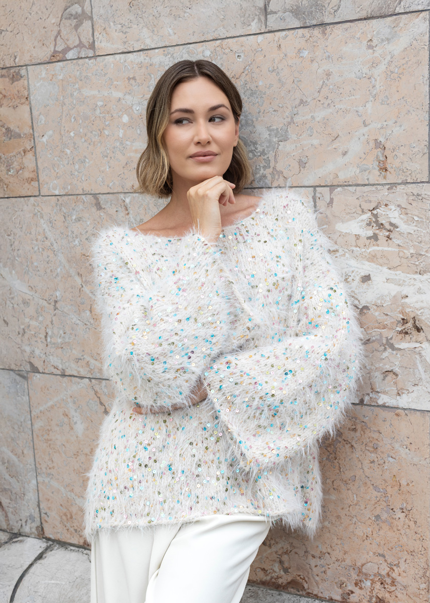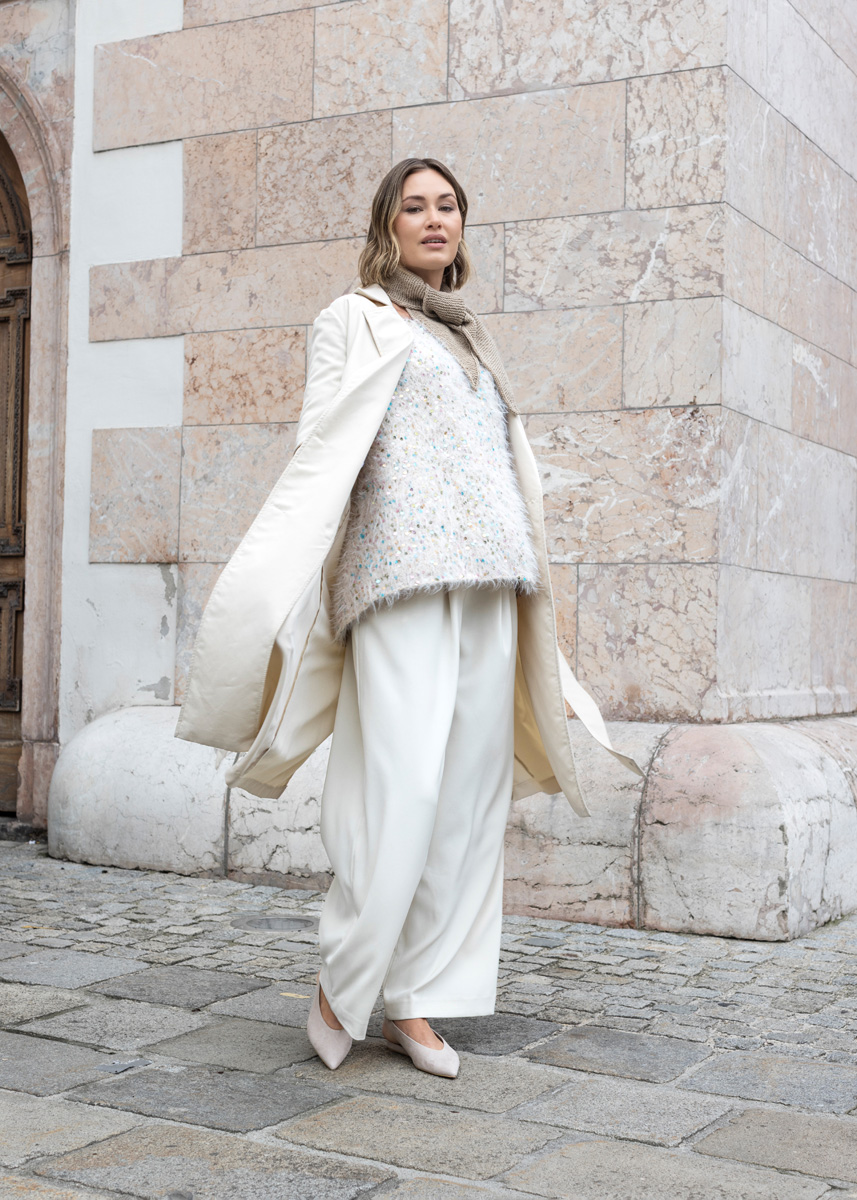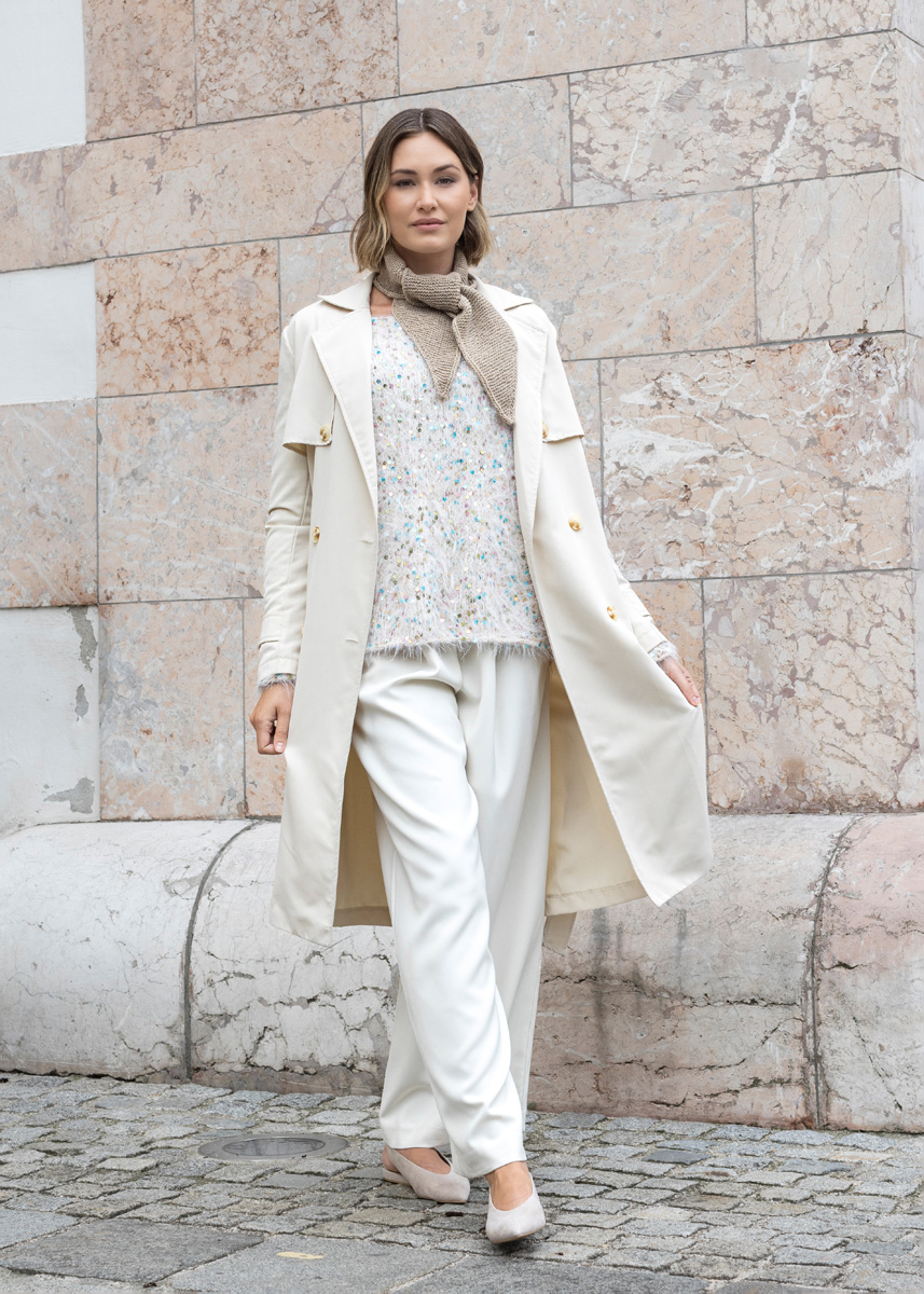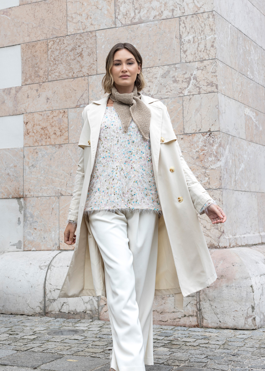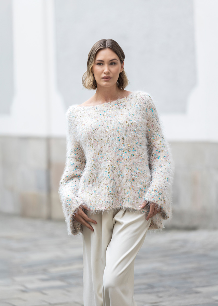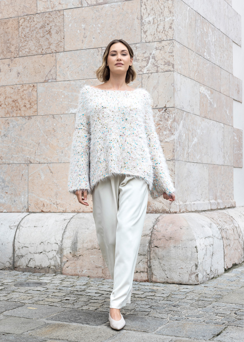 The pullover has a total length of 60 (62 - 64 - 66 - 68 - 70) cm and a positive ease of 40 cm at 80 cm bust circumference (40 cm at 88 cm bust circumference - 36 cm at 96 cm bust circumference - 36 cm at 104 cm bust circumference - 32 cm at 116 cm bust circumference - 32 cm at 128 cm bust circumference).