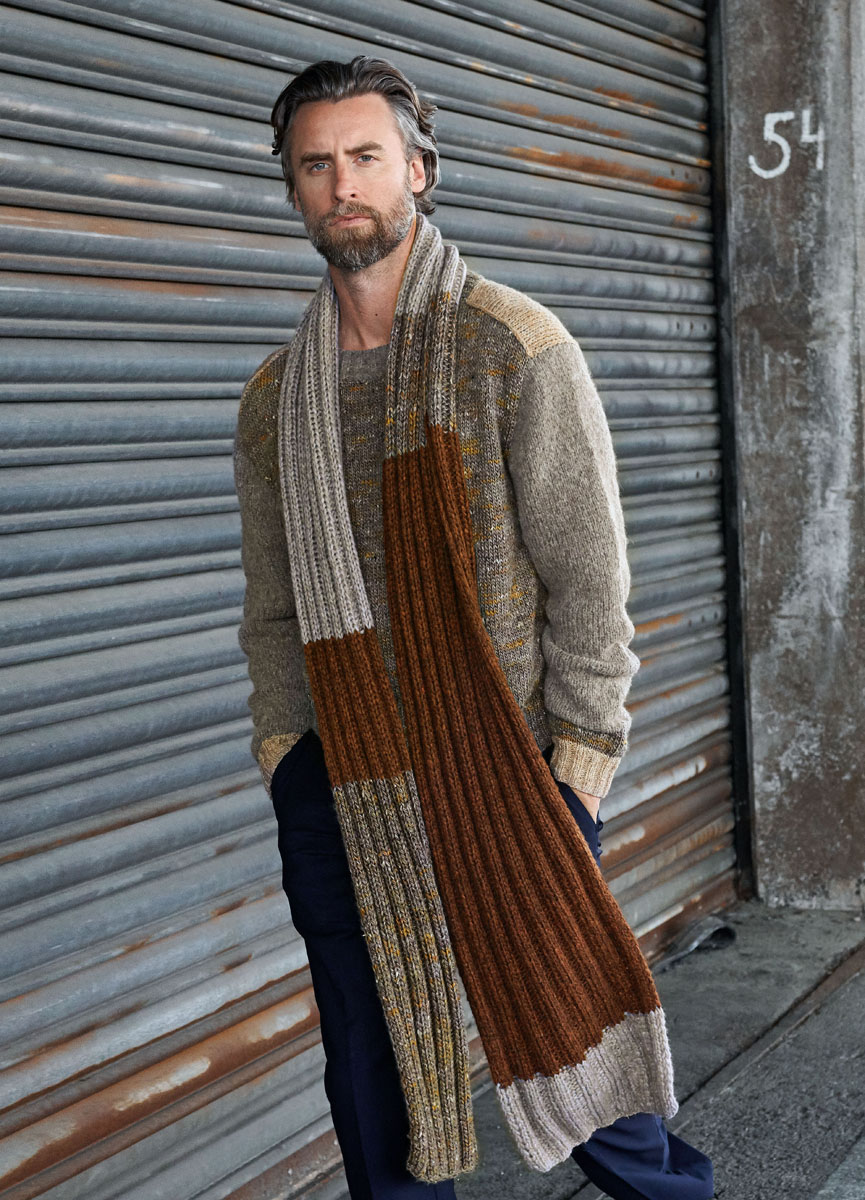 150 g of Lana Grossa Cool Air (55% Merino wool, 33% baby alpaca, 12% polyamide; 125 m/50 g in Red/Brown (col 16) and 100 g in Greige (col 2) and 150 g of Lana Grossa Only Tweed (76% superwash Merino wool, 16% acrylic, 5% silk, 3% viscose; 135 m/50 g) in Grey-Brown/Beige/Mustard/Ochre (col 107). Size 7 and 8 mm needles
