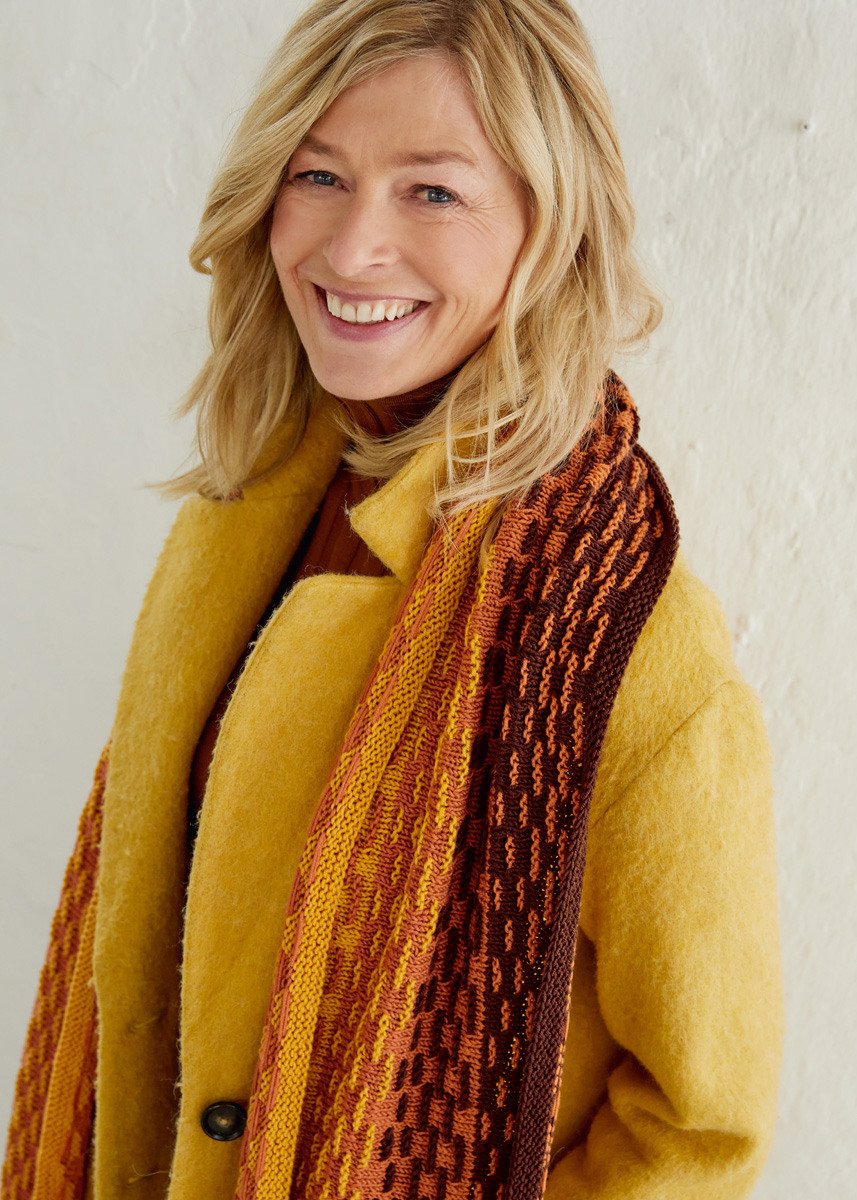 150 g of Lana Grossa Cool Wool (100% pure wool; 160 m/50 g) in Rust (col 2082) and 100 g each in Mocha (col 2074) and Dahlia (col 2083). Size 3.5-4 mm circular needle