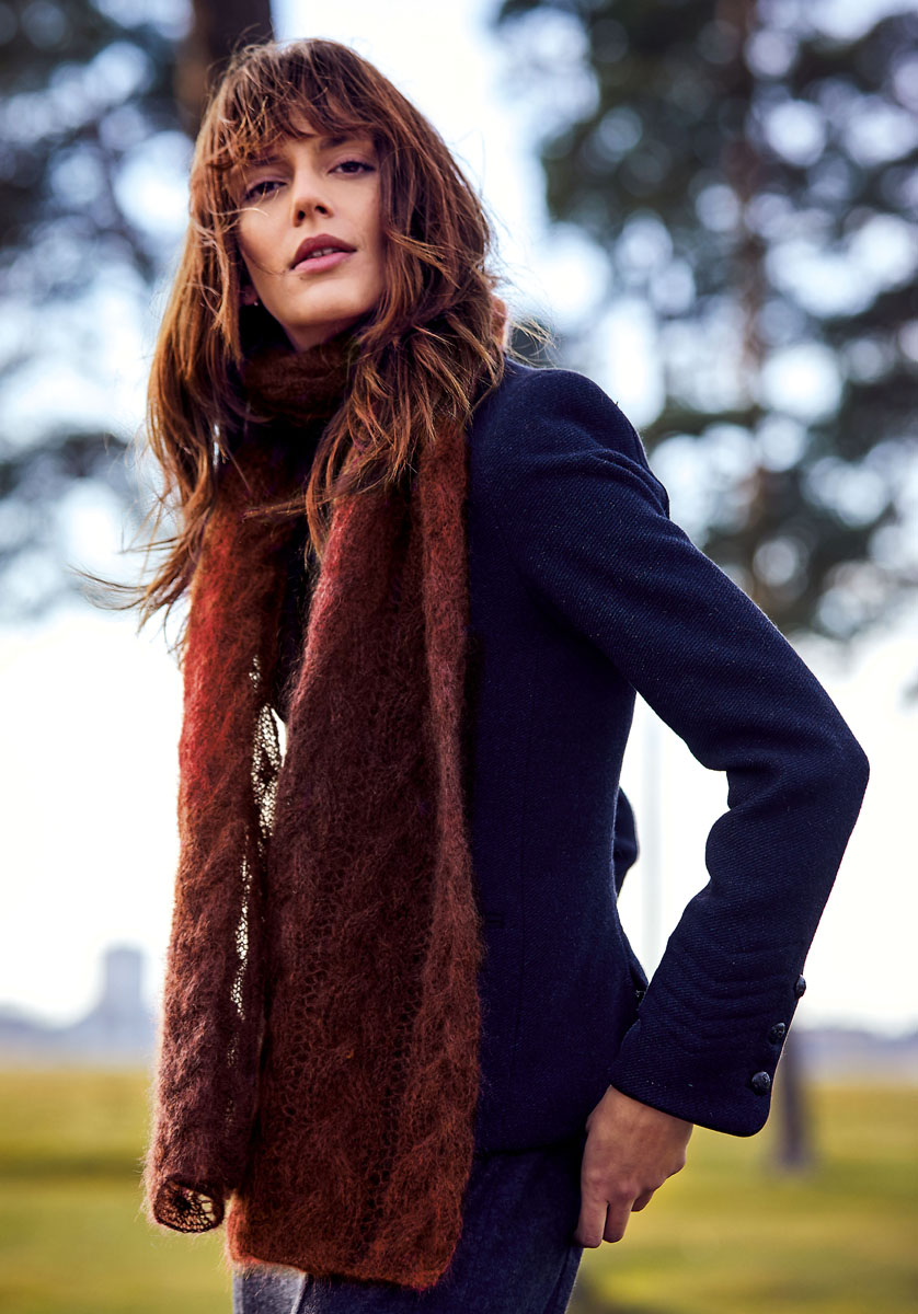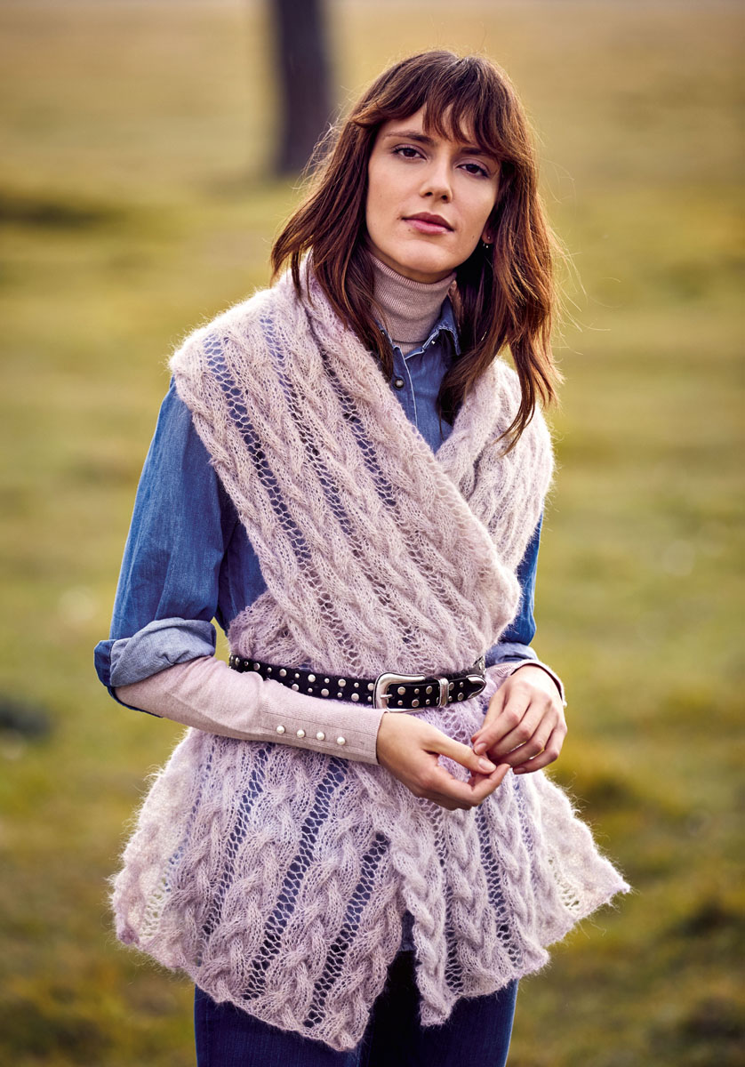100 g of Lana Grossa Gomitolo Silkhair (65% superkid mohair, 30% silk, 5% Merino wool; 800 m/100 g) in Pink/Beige Melange (col 201) or 100 g in Blue/Red Violet Melange (col 208) or 100 g in Red/Burgundy Melange (col 209) . Size 5 mm needles; cable needle [cn]