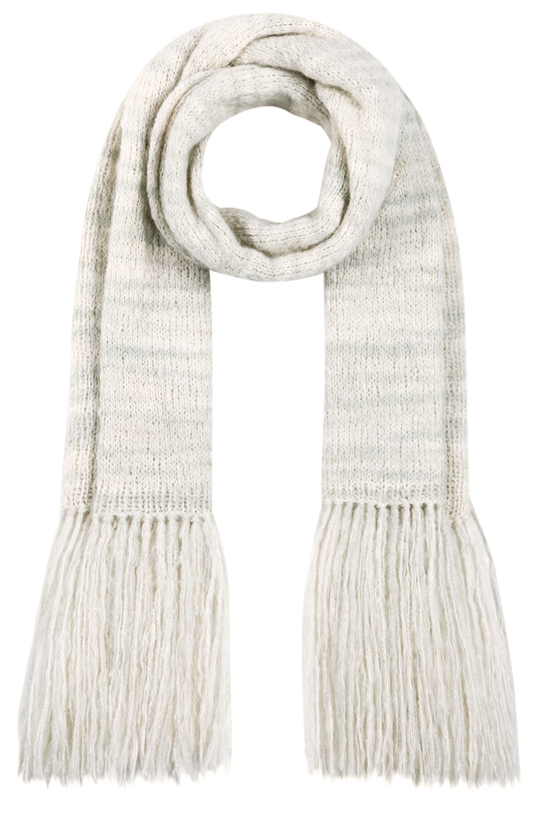 200 g of Lana Grossa Inizio Pelo (40% baby alpaca, 30% Merino wool, 15% polyamide, 9% Modal, 6% cotton; 185 m/50 g) in Off White/Silver Grey (col 2). Size 5 mm circular needle, 60 cm long; size 4 mm crochet hook for fringe