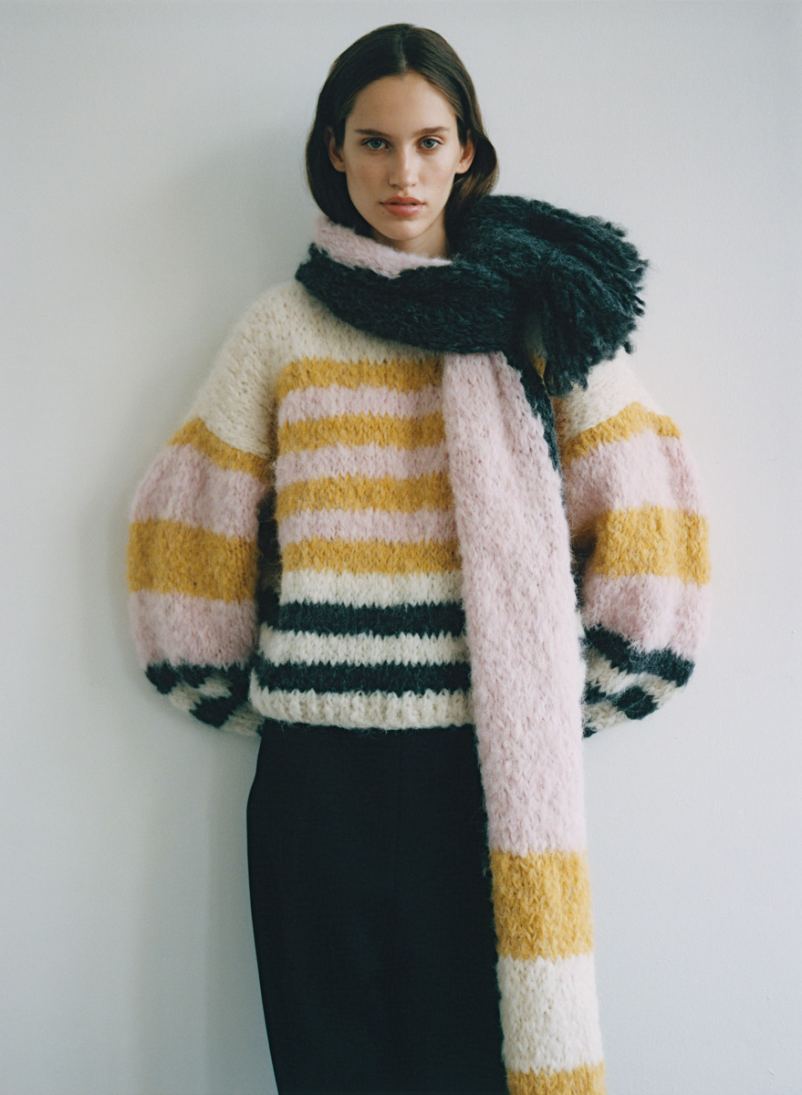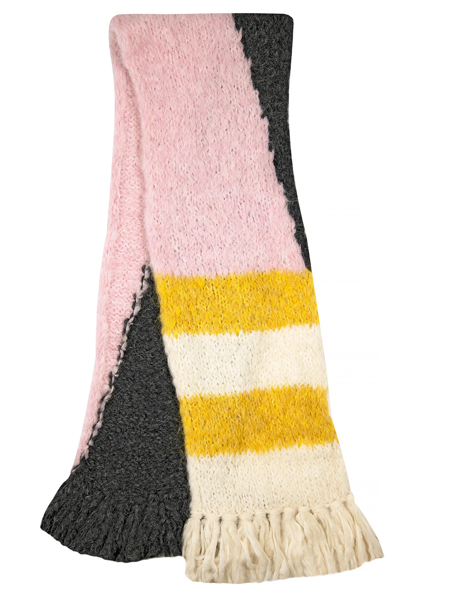 100 g each of Lana Grossa Lala Berlin Furry (90% baby alpaca, 10% polyamide; 75 m/50 g) in Charcoal (col 10) and Pastel Pink (col 12); 50 g each in Yellow (col 3) and Natural (col 1). Size 10 mm needles; size 8 mm crochet hook
