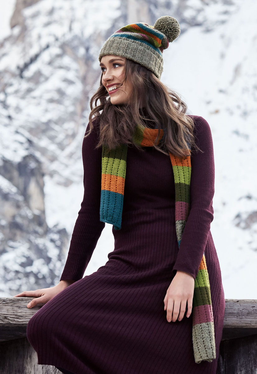 50 g each of Lana Grossa Merino Uno (100% superwash Merino wool; 125 m/50 g) in Light Grey (col 10), Mauve (col 17), Loden (col 20), Apple (col 21), Orange/Brown (col 15) and Dark Petrol (col 6). Size 5.5 mm needles