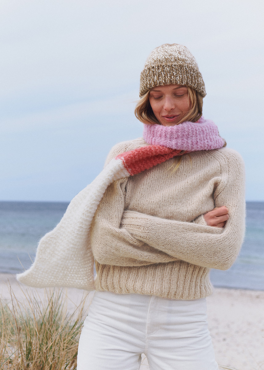 50 g each of Lana Grossa Natural Alpaca Lungo (89% baby alpaca, 11% polyamide; 190 m/50 g) in Off White (col 01), Brown (col 03), Light Red (col 11) and Pink (col 14). Size 7 mm needles.