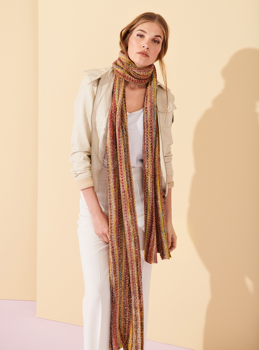 100 g each of Lana Grossa Pappagallo (50% cotton, 50% microfiber; 340 m/100 g) in Salmon/Natural/ Mocha/Light Olive/Bordeaux/Coral (col 4),Orange/Gold-Brown/Pink/Dark Violet/ Linen/Red Violet/Copper (col 5) and Corn/Green-Yellow/Lilac/Light Olive/Light Grey (col 11). Size 4.5 mm needles