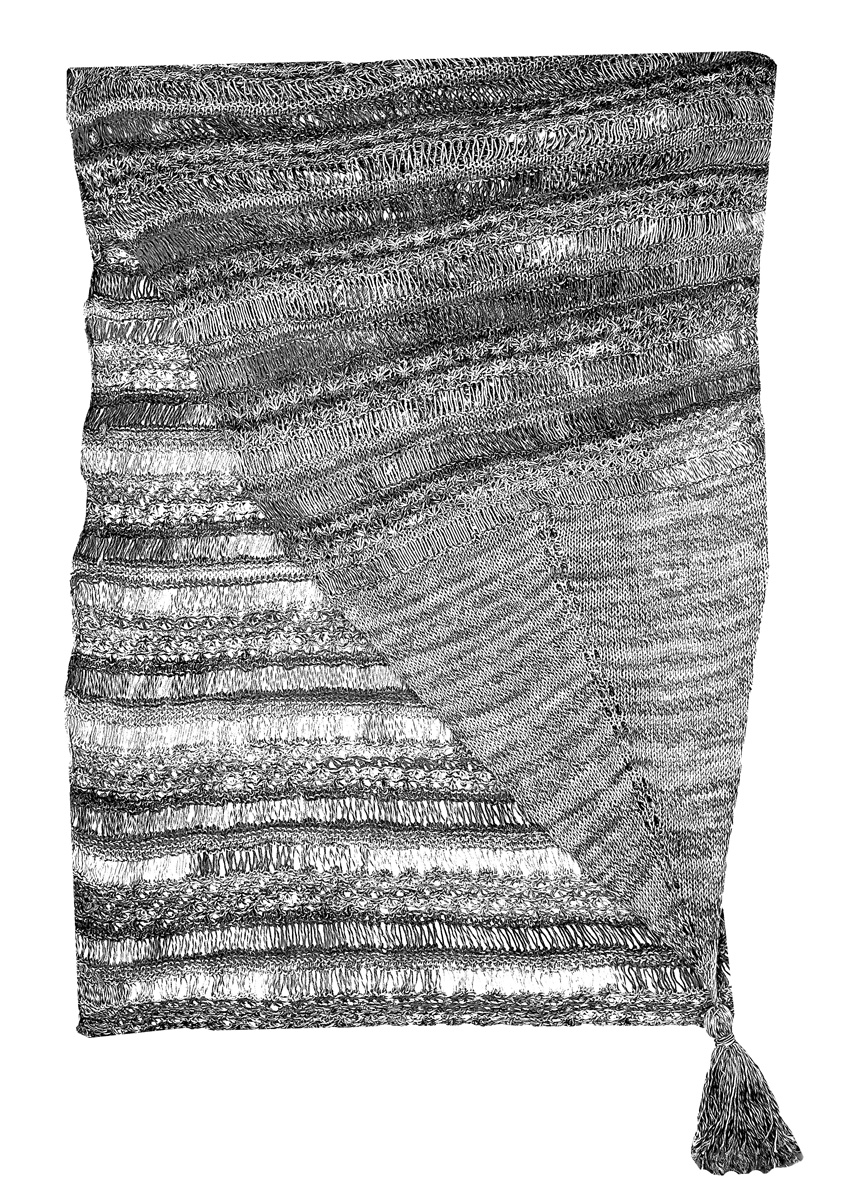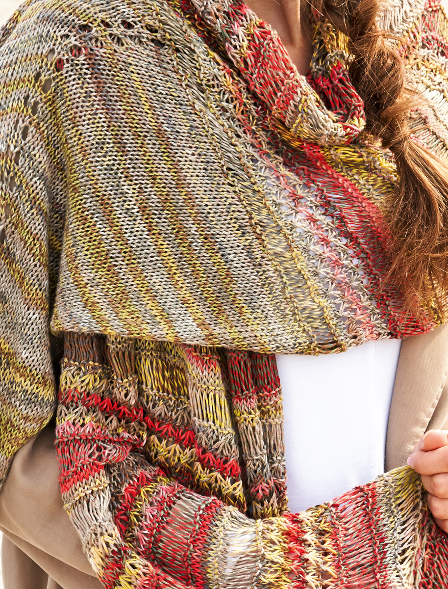 200g of Lana Grossa Pappagallo (50% cotton, 50% microfiber; 340 m/100 g) in Brown/Yellow-Green/Natural/ Dark Grey/Greige/Grey-Brown (col 12) and 100 g in Salmon/ Natural/Mocha/Light Olive/Bordeaux/Coral (col 4). Size 5 mm needles