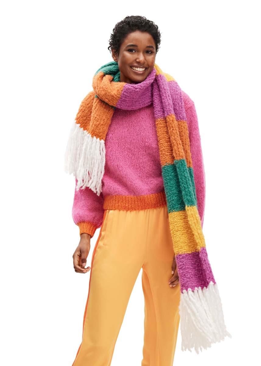 50 g each of Lana Grossa Royal Alpaca (93% royal alpaca, 7% polyamide; 95 m/50 g) in Orange (col 4), Emerald (col 13), Yellow (col 3), Orchid (col 6) and White (col 1). Size 8 mm needles; size 7 mm crochet hook.