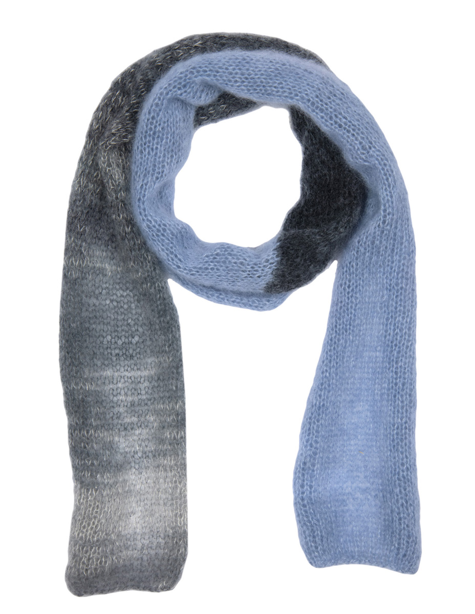 50 g each of Lana Grossa Silkhair Print (70 % superkid mohair, 30 % silk; 400 m / 50 g) in Natural / Light Grey / Dark Grey / Black (col 323) and Lana Grossa Silkhair (70 % superkid mohair, 30 % silk; 210 m / 25 g) in Sky Blue (col 92). Size 5 mm needles