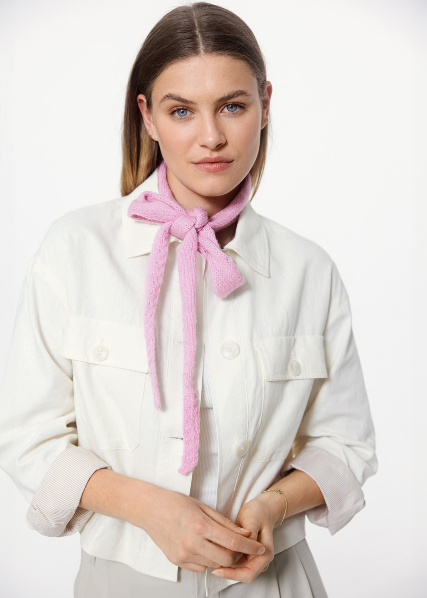 50 g of Lana Grossa Soffio (60% superfine Merino wool, 30% organic cotton, 10% cashmere; 212 m/25 g) in Pink (col 1) and 50 g of Lana Grossa Cool Wool Lace (100% extrafine Merino wool; 400 m/50 g) in Pink (col 52). Size 4 mm needles.