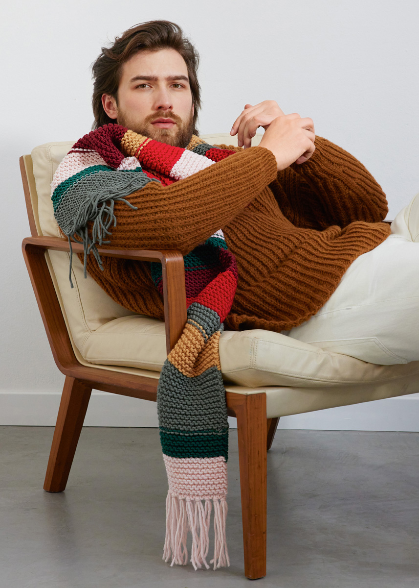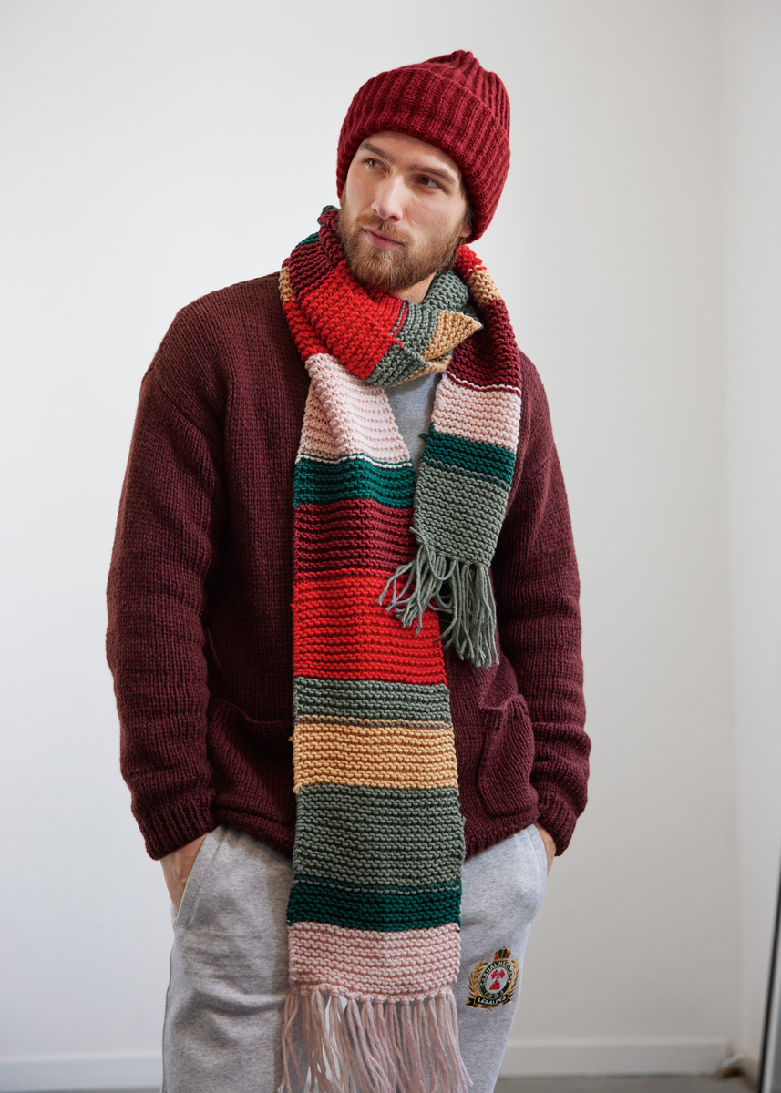 100 g each of Lana Grossa Superbingo (100% pure wool; 55 m/50 g) in Khaki (col 94), Pastel Pink (col 102), Wine (col 91) and Bright Red (col 42); 50 g each in Bottle Green (col 57) and Apricot (col 98). Size 7 mm needles; size 5 mm crochet hook for fringe