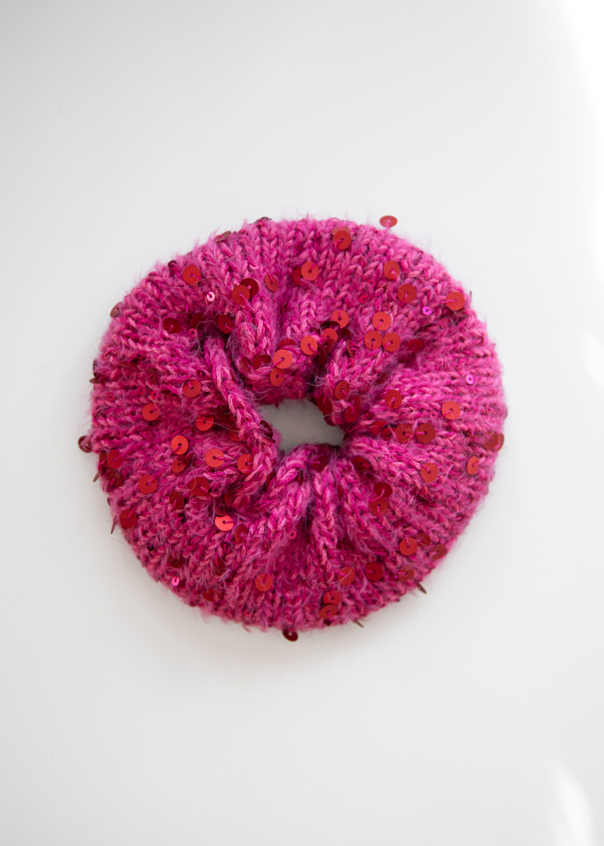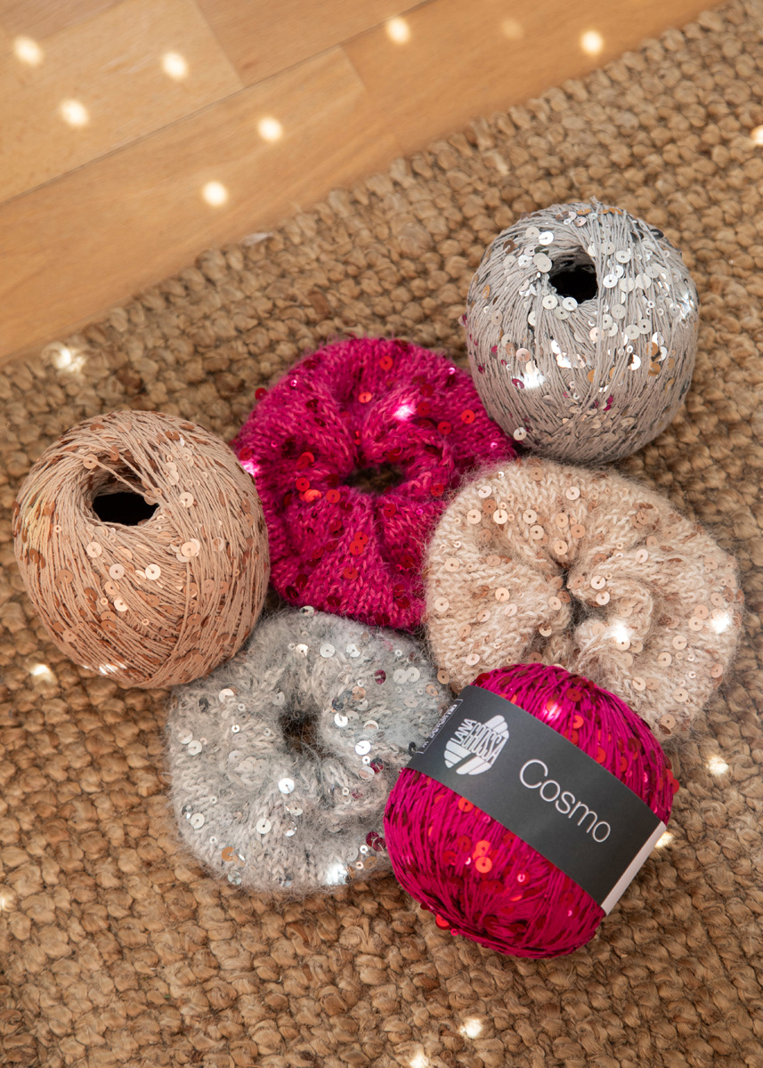 Scrunchie Mila is an elegant accessory with a subtle touch of glamour. Knitted with one strands of Per Fortuna and Cosmo held together, it combines a pleasantly soft feel with a delicate sequin shimmer. The stockinette stitch beautifully highlights the high-quality yarn combination, giving the scrunchie a timeless and refined look.