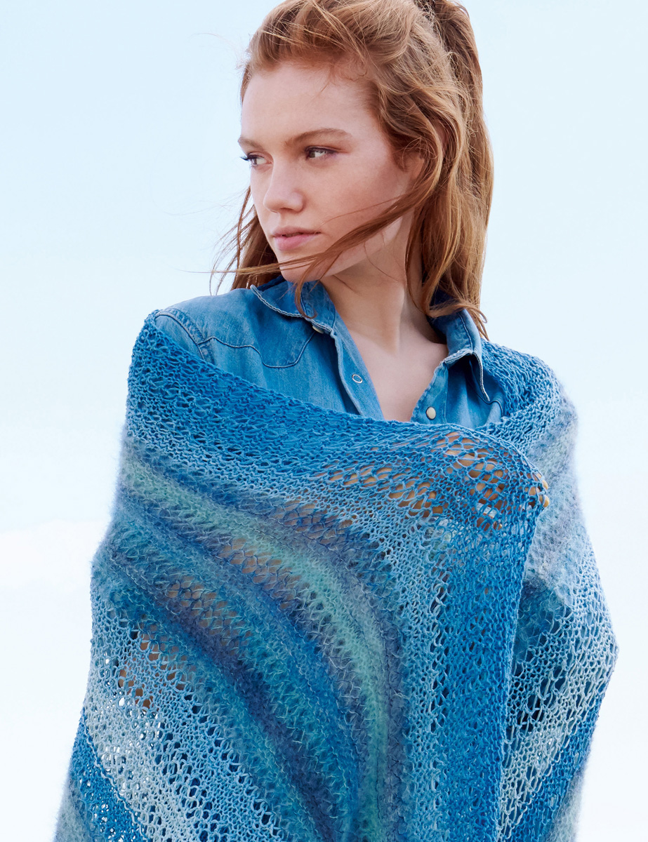 300 g of Lana Grossa About Berlin Chilly Dégradé (100% linen; 390 m/150 g) in Blue Dégradé (col 103) and 150 g of Lana Grossa Silkhair Print (70% superkid mohair, 30% silk; 400 m/50 g) in Light Blue/Mint/Grey/Petrol (col 360). Size 5 mm circular needle, 120 cm long