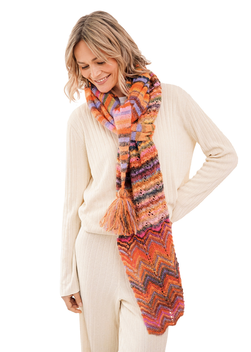 Shawl A: 300 g of Lana Grossa Colorissimo 2 (100% extrafine Merino wool; 300 m/100 g) in Red/Wine Red/ Petrol/Green/Grey Brown/Cognac (col 106) and 25 g each of Lana Grossa Silkhair (70% superkid mohair, 30% silk; 210 m/25 g) in Orange (col 171), Orchid (col 194) and Yolk (col 170). Size 4.5 mm needles; cable needle [cn].
