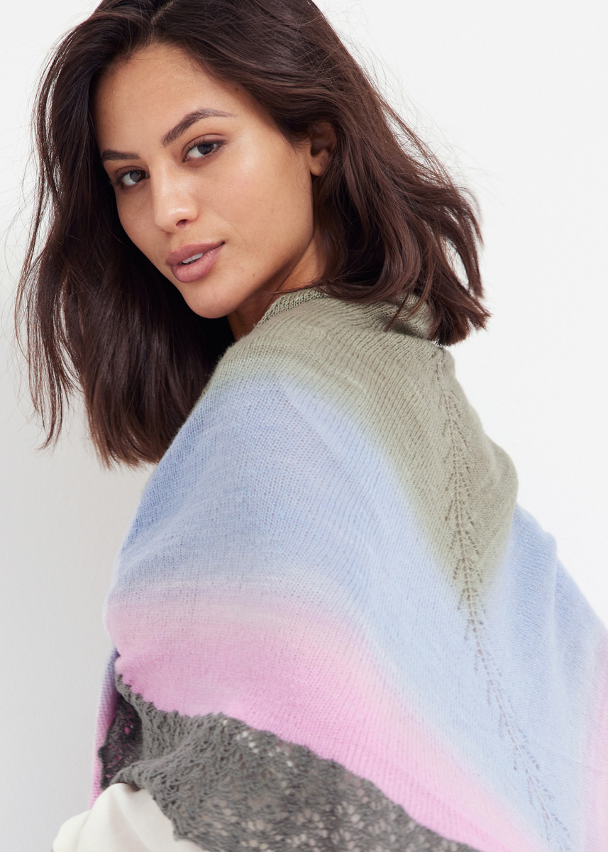 100 g of Lana Grossa Cool Wool Lace handdyed (100% Merino wool; 800 m/100 g) in Kajol (col 805); 50 g of Lana Grossa Cool Wool Lace (100% Merino wool; 400 m/50 g) in Khaki (col 7). Size 3 mm circular needle, 100 cm long; stitch marker