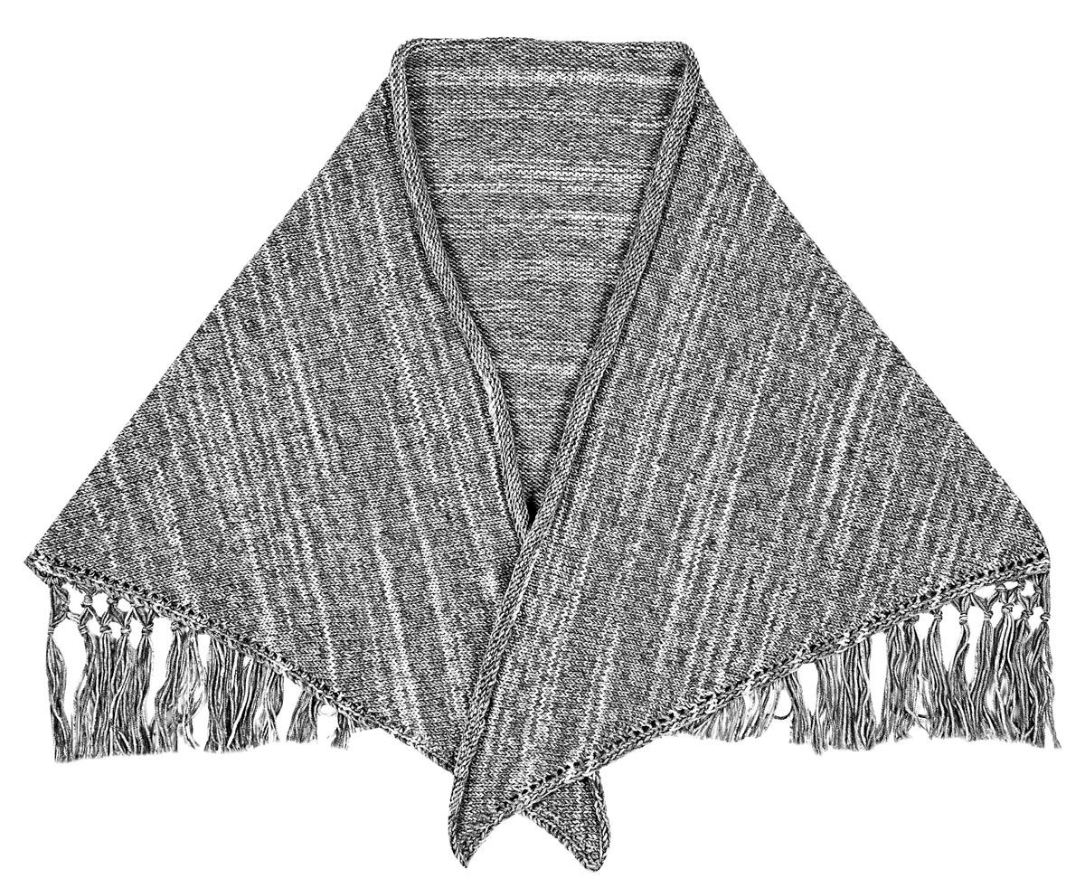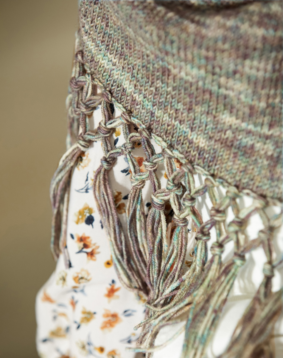 250 g of Lana Grossa Cool Wool Semi Solid (100% pure wool; 160 m/50 g) in Grey-Green/Antique Violet/ Ecru Mélange (col 6505). Size 3.5 mm needles; size 3 and 4 mm crochet hook