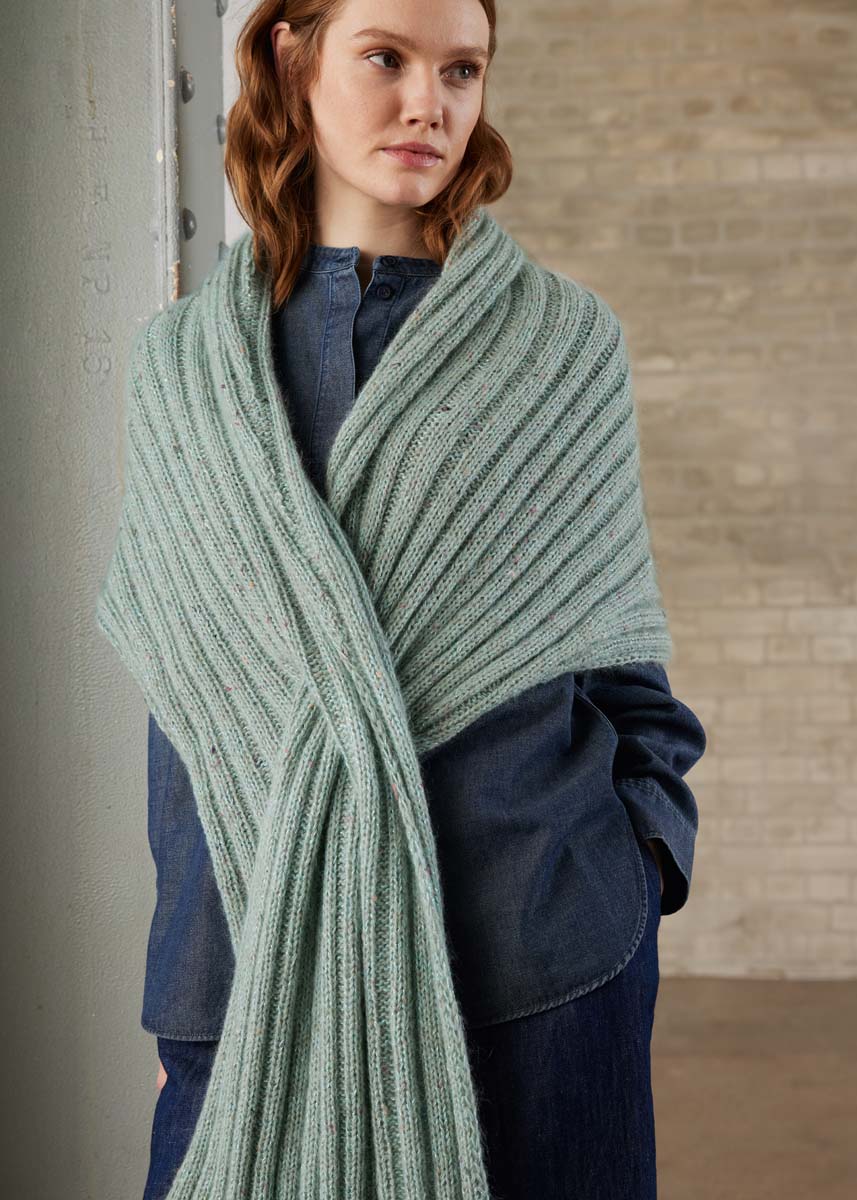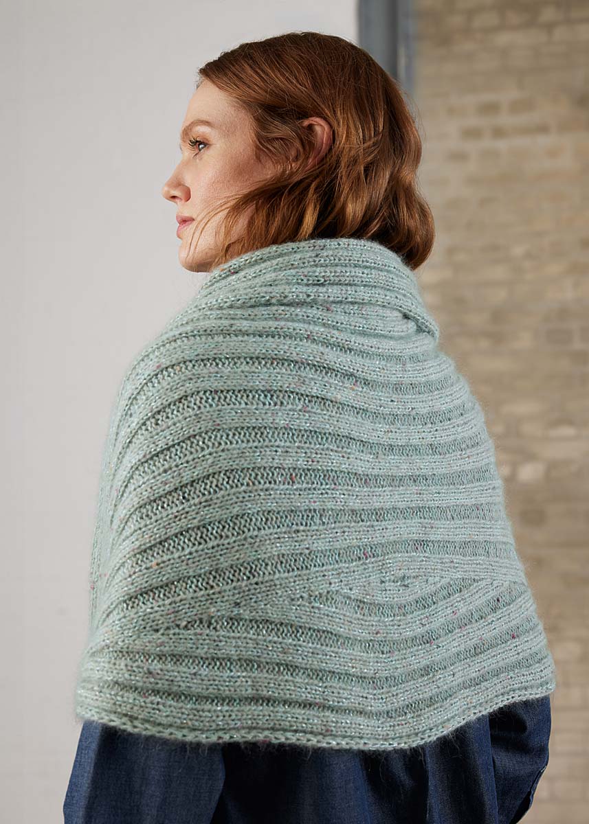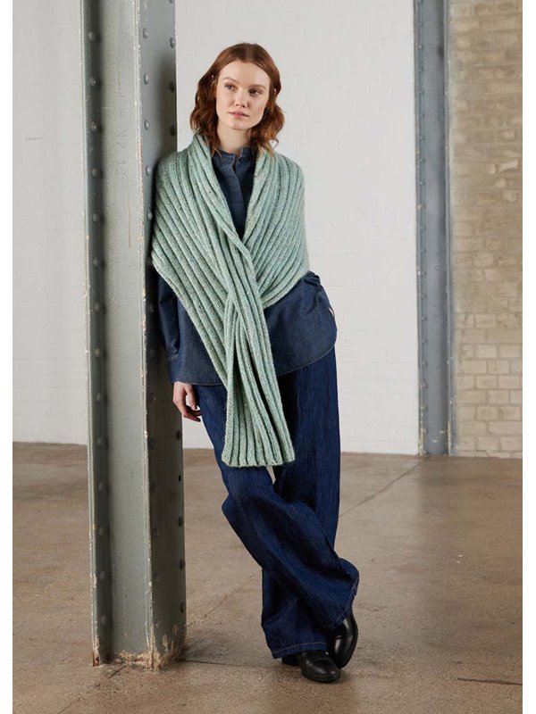 250 g of Lana Grossa Ecopuno (72% cotton, 17% Merino wool, 11% baby alpaca; 215 m/50 g) in Grey Beige (col 93); 125 g of Lana Grossa Brillino (83% viscose, 17% metallic fiber; 200 m/25 g) in Pastel Green/Silver (col 11); 125 g of Lana Grossa Natural Superkid Tweed (60% superkid mohair, 30% silk, 7% cotton, 3% polyester; 200 m/25 g) in Grey Green (col 617). Size 5.5 mm circular needle, 80 cm long.