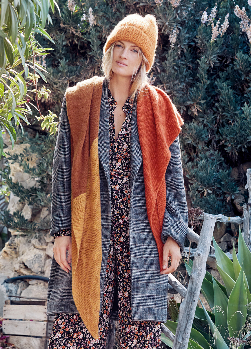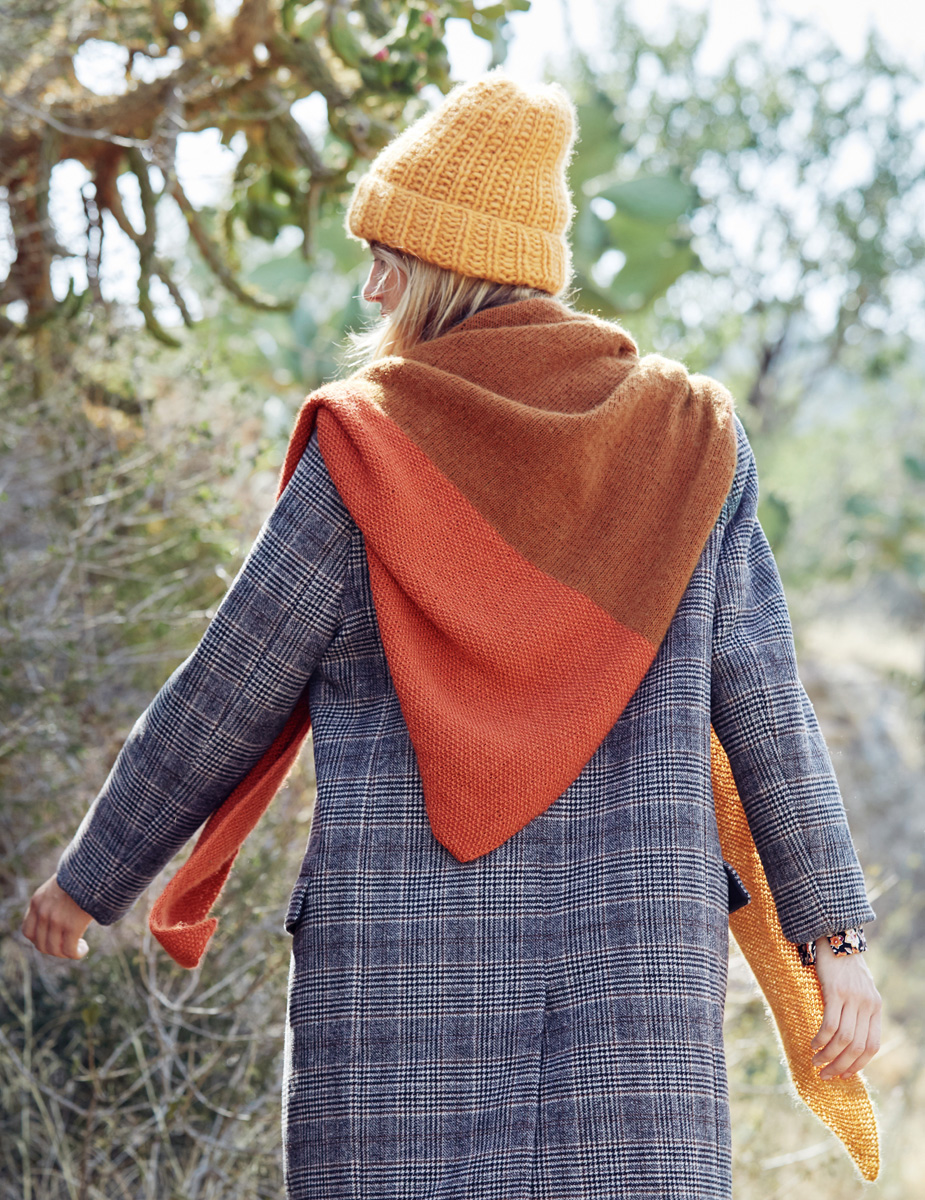 100 g each of Lana Grossa Ecopuno (72% cotton, 17% pure wool, 11% alpaca; 215 m/50 g) in Yellow/Orange (col 33) and Red/Orange (col 34); 150 g in Camel (col 32). Size 4.5 mm needles