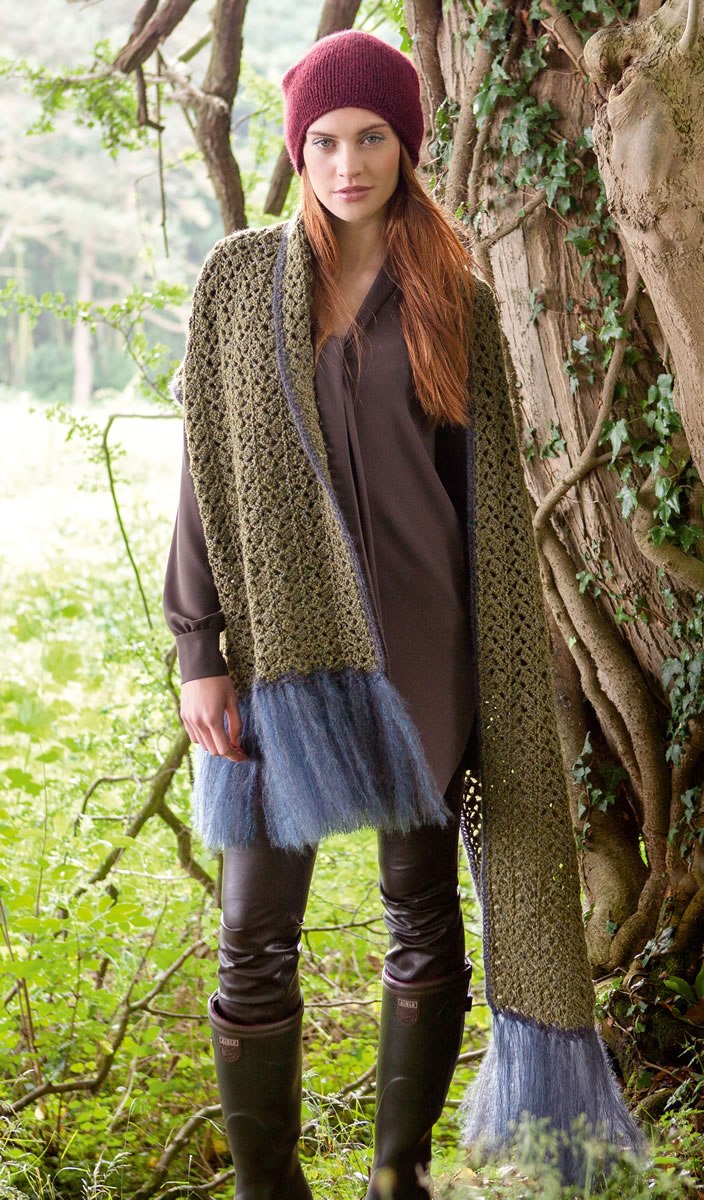 550 g of Lana Grossa Melodia (41% Merino wool, 32% polyester, 13% acrylic, 10% alpaca, 4% nylon; 105 m/50 g) in Olive/Silver (col 10) and 50 g of Lana Grossa Silkhair Degradé (70% superkid mohair, 30% silk; 400 m/50 g) in Dove/Grey/Brown (col 853). Size 4.5 and 6 mm crochet hook.