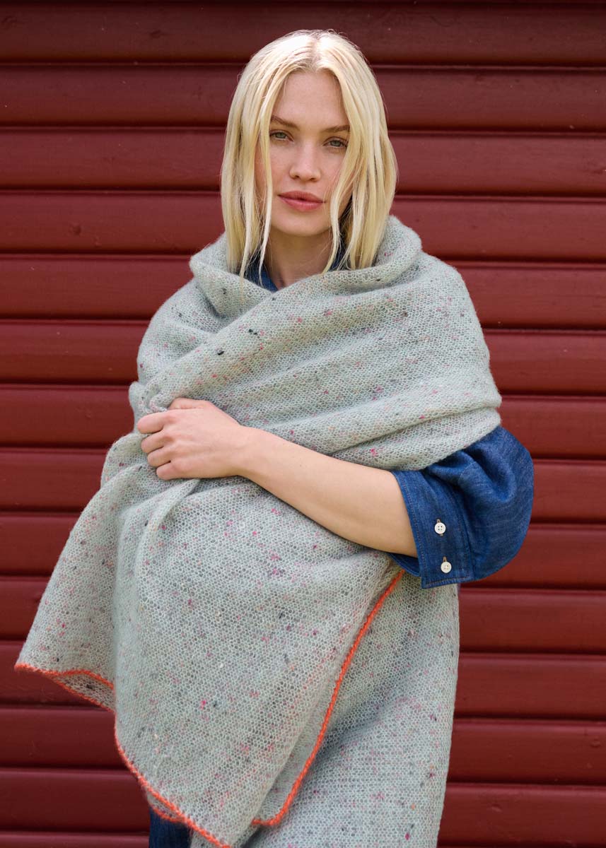 200 g of Lana Grossa Natural Superkid Tweed (60% superkid mohair, 30% silk, 7% cotton, 3% polyester; 200 m/25 g) in Grey Green (col 617); 25 g of Lana Grossa Silkhair (70% superkid mohair, 30% silk; 210 m/25 g) in Salmon (col 207). Size 4.5 mm circular needle, 120 cm long; size 3.5 mm crochet hook.