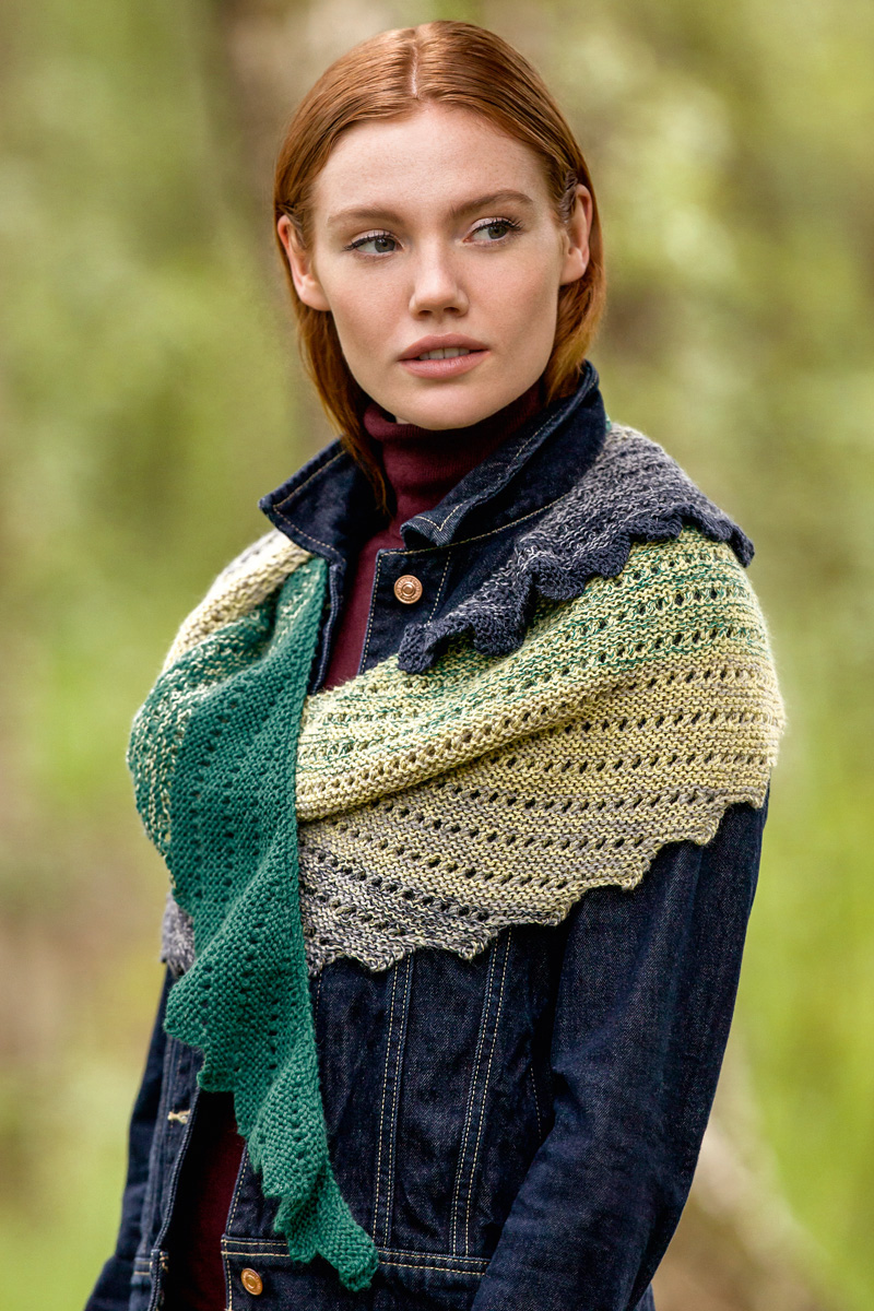 200 g of Lana Grossa Shades of Alpaca Silk (45% Merino wool, 35% baby alpaca, 20% silk; 680 m/200 g) in Black-Green/Grey/Yellow/Petrol (col 315). Size 4 mm needles